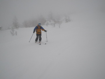 | 今シーズンの山スキー第一弾は3連休を利用して信州に行く事になった。 当初は頚城周辺で日帰り3本を計画していたのだが、折からの豪雪&寒波到来で妙高周辺はえらい事になってそう(^−^; なので前日に急遽比較的天気の安定してそうな四阿山周辺に行く事に変更した。 東京から来るかっきーとは上田市のコンビニで合流してまずは菅平高原に向かう。 初日は根子岳にするか四阿山にするか迷ったがシーズン1発目なのでリフトで他力本願できる根子岳で慣らそうと決定。 菅平高原の奥ダボススキー場の駐車場にクルマをとめてリフトが動き出すまでしばし待機。 ここも寒波の影響で天気はイマイチだが頚城よりはマシだろう。 奥ダボストリプルチェアリフトで一気にゲレンデTOPへ。いきなり1546m♪ 他力本願成就なり(^−^) さっそくシールを貼って出発〜!! ってコースは圧雪されたこれ(^−^;?? とりあえずゲレンデと変わらないような圧雪路を進んでいく。 どこまでも続く圧雪路。。 雪道ラッセルも山スキーの醍醐味な僕らにとっては退屈な道が延々続いていく。 途中で会った地元の人の話によると、ヘリスキーのルートになっていて晴れていればどんどんスキーヤーを運んでるらしい^−^; う〜ん、ならば今日はこの天候でよかったかも。。 それでもこの圧雪路には閉口。 「こんなん山スキーちゃうや〜ん(><)」と嘆きながら頂上を目指す。 途中1780mあたりで避難小屋を横目に見ながら登っていく。 天候はどんどん下り坂のようだ(><) なんとなく名前がかわいい小根子岳の山腹をからみながらだらだら登っていくうちヘリポートらしきところに出て圧雪路は終わっていた。 ここからやっと山道に入りそう♪ 僕たちが本日一番のりだったようでヘリポートから先はトレースがない。 適当に登山道らしきところを進んでいき急坂を登ると広々とした雪原に出た。 雪原を進んでいくと祠のある根子岳頂上(2207m)があった。 もちろんこの天気じゃ展望は望めない。 祠の横に鐘があったのでお約束でとりあえずこれでもかと叩きまくる。 遅れているこてっちゃんを待ってると先ほどの地元の人と他に単独スキーヤーが2人あがってきた。 さすがメジャールートこんな天気でも登ってる人がいてはる(^−^) 一番最初に着いて一番最後に滑り出すのはいつもの事。 だらだらと滑降準備をしてるあいだに他の人達はみんな滑っていっちゃった。 遅ればせながら我々も用意完了。いよいよ今シーズンの山スキー一発目!! 「根子岳ニャオ〜!!」って叫けびながら滑り出す。 が、最初の急坂でターンしたとたん板が外れてコケる(T◇T) 「なんで??」 目が点(・◇・)? よくよく考えるとチューンした時に開放値を標準に戻してしまっていた。 昨シーズンも標準値ではちょっとした事で板が外れるので開放値を上げてたんやった。。 失敗だ。。 ここで先ほどのスキーヤーのひとりと登ってこられた女性の方がお話されてた横を通り抜ける。 あとで聞くとこの女性はMINMINさんらしかった。昨年の双六小屋でもニアミスしていたようで今回もお話できず残念でした。。 そこからすぐに圧雪路に出てしまった。。 あとは圧雪路の横の新雪を拾いながら滑っていく。 どんどんガスが濃くなっていて滑っていても何が何だかわからない。 スピードが出てるのか、どんな斜面なのかもわからない。 真っ白けで盲目状態。「暗闇ならぬ白闇やあ〜」とわけのわからんことを叫びながら滑る。 おまけに時々小ギャップに突っ込んだだけで板が外れてぶっ飛ぶ(T◇T) あう〜 今シーズンの山スキー一発目は完全に消化不良のままゲレンデTOPまで戻ってしまった。 あとはそのままゲレンデを駐車場まで滑りそそくさと撤収。 まあ最初はこんなもんか・・・ 撤収後はあずまや高原ホテルで温泉につかり国道の空スペースに駐車して寝る。 旅は四阿山へと続く。 |