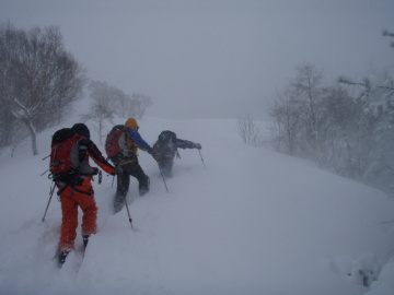 | 今日はいよいよにゃんこ岳でニャーと叫ぶ日だ。 しかし昨日から降り続く雪は朝になっても止む気配がない。 だんだん回復傾向の予報を信じてとりあえず登ってみよう。 駐車地横の斜面に取付きひと登りで久手牧場に飛び出る。開けた斜面を登っていく。相変わらず雪は止まない。 牧場を越えると樹林帯の登りに変わる。ラッセルだが4人で交代しながら登るので余裕だ。 樹林帯をどんどん登るといきなり視界が開ける。どうやら乗鞍ドライブウェイの夫婦松駐車場についたようだ。 ここからはドライブウェイをショートカットしながら登る。天気もなんとなく回復の兆しを見せてきたようだ。 標高2300mくらいまであがるとドライブウェイが大崩山をトラバースするようになるので我々も道路を進む。 いよいよ正面に目的の猫岳が見えてきたにゃん♪ ドライブウェイが右にカーブをするあたりで大崩山と猫岳の鞍部に向けて登るにゃん。 上部は風が強く雪面はクラストしだしたにゃん。鞍部から猫岳を目指す途中で板が滑りまくるのでクトーをつけるにゃん。 クトーの爪を効かせながら登りきると猫岳(2581m)のてっぺんに到着にゃん。 ひどい強風だがとりあえず目的の猫岳でニャーポーズだけしてすぐに滑降開始にゃん。 最初はガリガリ言いながら滑り降りるが鞍部から少し下ると快適な雪質になる。 傾斜の緩い場所は登りのトレースを利用しながらどんどん下る。 夫婦松駐車場から樹林帯を通り抜け久手牧場の極上のパウダーを楽しみながら駐車地に戻った。 とりあえず猫岳でニャーと叫べてなので満足です。 同行のみなさまありがとニャー。 |
