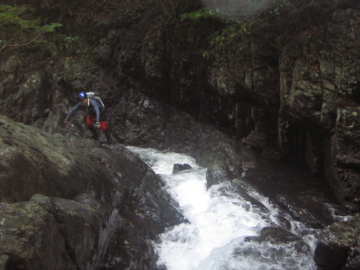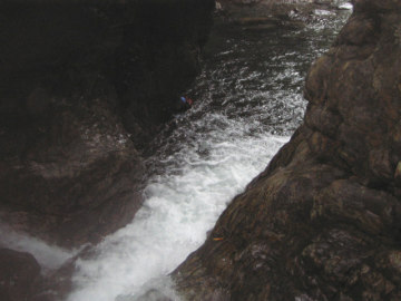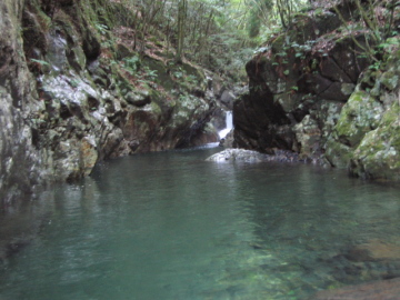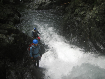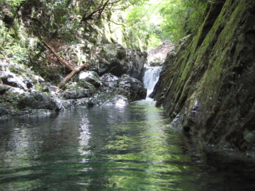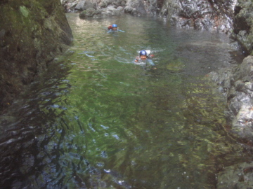 | 最初のゴルジュが始まる | 2段7m滝 泳いで右の岩に取り付く |
