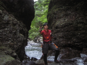 | 8m滝の上からは再びゴルジュ状になる。 幅広の3m滝を越えて小滝をいくつかやり過ごすと、両岸が極端に狭まった行合いの3m滝が登場。 釜を左岸沿いに泳いでいく。 滝に近づくにつれて流れが強くなるので壁を伝いながらじりじり詰め寄る。 最後は気合でうおりゃ〜っと滝に取り付いて通過^-^ さて、残る二人は大丈夫かなあ。。 正に高見の見物気分♪ ・・なかなか続いてこない^-^; 岩壁にかくれて笑い声はするけど姿は見えないのが残念。。 楽しそうでいいなあ。。 しばらく待つが ・・まだこない。。 やはり流れがちょっとキツイのかなあ。。 笑い声だけ聞こえる。。 混ざりたいなあ。。 すると憲ちゃんがじりじりと近づいてきた! 滝の取り付きで苦労してるのでスリングで引っ張りあげる。 さて、まっちゃんは・・・ しばらく待ってると流れに負けて流れていくのが見えた。 力尽きたようだ。。 さようなり〜(T◇T)/ もう少し悪戦苦闘してる姿を見たかったが、しかたがないのでロープを出して引っ張ることにする。 行合いを過ぎるとゴルジュは終わる。 いくつか滝を越えていくと8m滝。 左壁に左上するバンドがあるのでそれを使うことにする。 バンドに乗り上がるのに僕とまっちゃん二人がかりでヒーヒー言ってたのに憲ちゃんは倒木を使って一人でひょいと乗ってしまった。 乗ってしまえばラクラク滝上へ♪ 滝上に上がると正面に50m滝が見えてきた!! 手前の15m滝の横を登り50m滝の前に立つ。 かなり豪快だ! まっちゃん、憲ちゃんコンビもよろこんでいるようで良かった^-^ 高巻きルートを目でおって探すと、右岸の岩稜を登れそうだが今日の水量では対岸に渡る勇気が出ない。 失敗したら15m滝下までもっていかれてしまうだろう。 なのでいったん15m滝の下までもどりそこから右岸を高巻くことにする。 しかし、この高巻きは出るわ出るわ(><) ヒルだらけ。 ひええええ〜 あっちにもこっちにもヒルが立ちあがってユラユラと揺れているじゃないですかっ!! 靴に乗っかってくる無礼なヒルにはかたっぱしから虫除けスプレーをかけて指ではじく。 沢タイツ&ネオプレンの靴下で足回りは絶対的な安心感があるのだが、やはり気持ちいいものではない。 こんな所ではぜったいコケたくない。。 足早に巻き上がり沢床にもどってホッと一息 |