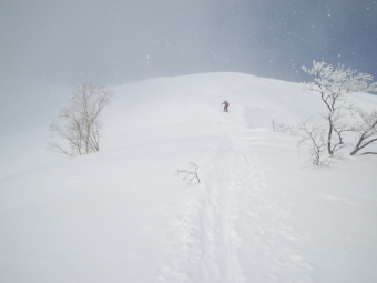 北東尾根も高度を下げるとだんだん重い湿雪に変わってきて板がまわりにくくなる。