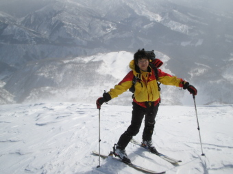 野伏ヶ岳の頂上で記念撮影 頂上直下を滑るたかやん