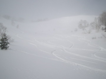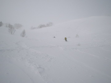 | このあたりはまだ快適な滑り | 雪が重いのでほぼ直滑降 |