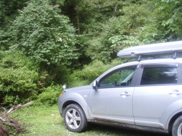 早朝駐車地であるヌタハラ谷沿いの林道最初のカーブに到着。少し仮眠のつもりがあまりの眠さに出発が8時を回ってしまう。