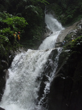 | 水が多くて楽しく進める | 5m滝の奥に石棚2段20m滝が見えてきた |