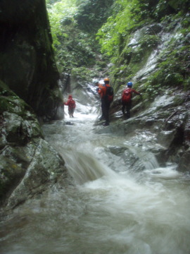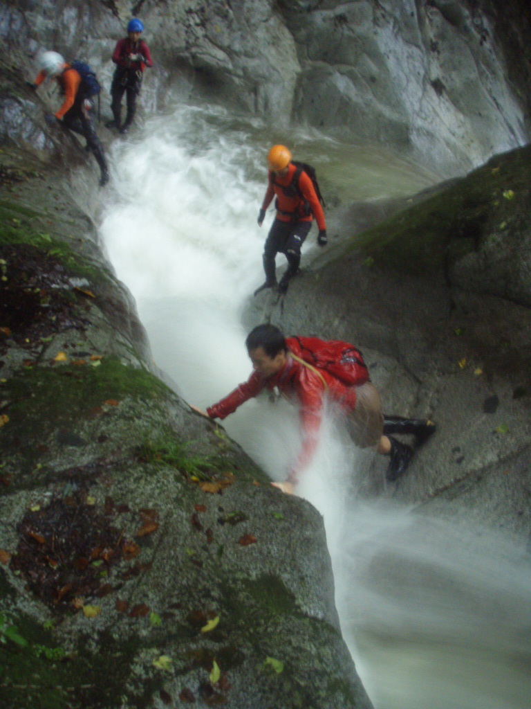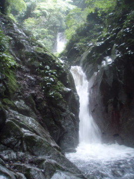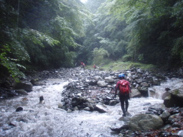 | 予定ではホラノ貝ゴルジュだったが天気がそれをゆるさない。 せっかく山梨までやってきたのに・・・ いろいろ代案を考えていると、けも氏が小川谷廊下はどない?とのたまう。 携帯で天気予報を見ると奥秩父より丹沢の方がまだマシのようだ。 関西人の僕でもうっすらと聞いたことある名前だったのでほんじゃそこにいくっ!となる。 やまない雨の中を2時間ほどかけて丹沢に移動。雨はどんどん強くなるようだ。 廊下やのにこんな雨降りでもいけるの?と、小川谷7回目のけも氏と昨年行っただるだるに聞くとラクショーとのこと。 ほんまか?? ヘンタイの言葉をうっかり信じるとハマってしまうので油断できない。 林道ゲート手前のスペースにクルマを止めて出発準備。昨夜の深酒で自爆したにゅで氏をクルマに放置し歩きだす。 まずは林道を下っていき途中でコガイ平沢に降りる。いくつか堰堤をハシゴで下り、小川谷出合に到着。 最初は広い河原だがすぐに廊下状になってくる。2mくらいのF1を右壁から登るとお次はCS5m滝が出てきた。 ここはCSの右側の倒木を利用して登る。ちびっこのたかやんは苦戦してはる。なんとかしてあげたいが身長はどうすることもできない。 雨脚はどんどん強くなるようで、またまた天気予報にだまされたのか。 廊下状の中に滝がいっぱい出てくる。とにかく登るのみだ。 この雨の様子だと濁るのも時間の問題だなと思っているとやはりみるみる濁ってきた。 ややこしい滝はないので水が多いのが幸いして楽しさも増しているようだ。普段何気なさそうな滝も手強くなってるのだろうなあ。 いったん河原になって右からワナバ沢が入る。すぐに第2ゴルジュに突入。 こちらも楽しい廊下状が続く。しかし水がどんどん増えてるのが気になる。 |