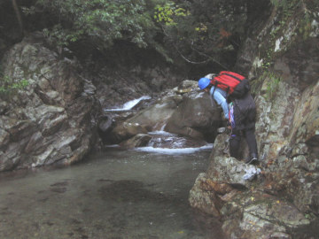 | 3m滝はみんな好きなところから登る。やまとさんは右岸をへつってから滝左の溝を。 まっちゃんは左岸から巻く。 僕は滝の左壁を直登した。 斜瀑5mを越えるとその先には9m滝が。 右岸から高巻く。 斜瀑8mは流芯から登るがあまりに冷たすぎるので左に逃げる^-^; 次に釜を持った12m滝。。。 釜か。。 やだなあと眺めているとまたまたやまとさんが左岸をへつり気味にどぼーんといっちゃった。。やっぱり(T◇T) まっちゃんも続いていく。。 仕方がない・・・ じゃぼん 冷た〜い(><) 滝自体は簡単に右を直登。 つづく斜瀑15mは左から巻き上がるが、まっちゃんのみ流芯を登る。 その後は谷が狭まって淵の奥に2段6m滝が。 夏なら泳ぐのだが今日は無理^−^; 左のバンドを伝って滝に取り付き直登。 しばらく行くと美しい釜がありその先で水流が細くなり斜瀑5mがある。 両岸の上から簡単に越えれるが、せっかくなので水線をつっぱりで越えていく。 その上の7m滝を越えると滝場も終わり穏やかな渓相に変わる。 あとは平凡な河原をガンガン飛ばし登山道の手前、左に枝谷が入るところでランチタイムにする。 今日はひさびさの鍋!! 寒いので早く食べたい〜 お湯が沸くのを待っていると嫌がらせのように雨脚が強くなる^−^; 仕方がないので持って来たシェルターを使うことに。。 シェルターの中に入り暖房用にやまとさんのガスを焚くと、見違えるようにあったかくなった♪ それもつかの間、いきなりやまとさんのガスストーブが火達磨に!! おお〜!! ファイヤー!! シェルターの中に炎がひろがる・・・ 「あかん爆発する!砂かけろ〜!!」っと砂かけババアならぬ砂かけジジイ3人が必死に砂をかける(T◇T; しかし火は止まらないシェルターから蹴りだして沢の中へシュート!! やっと火は止まった。。 これが今回一番の思い出・・・ 帰りは登山道を小走りで牛コバまで下り、車道を坊村まで戻りました。。 |