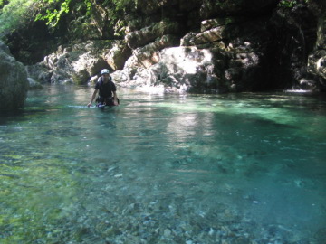 | 白川又川は美しく澄んだ冷たい水だった | 両岸狭まり足が届かなくなる・・・ 泳ぐの?? |