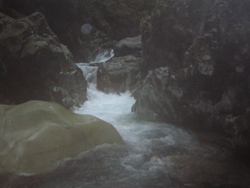 | 寒い寒いと言いながらも極力水際から離れないように泳いでは登って泳いでは登ってを繰り返していく。 少し渓相が落ち着くと右手に火吹谷出合を見る。 それもつかの間またまた泳ぐ登るたまに巻くを繰り返しいく。 途中の赤壁が見える場所でランチタイム休憩。 おにぎりをかじる♪ おいしい☆ ここで寒くて戦意喪失気味のヤマトさんは思い出したようにやっとレインウェアを着た。 二人とも寒くて思考能力が少し足らない。 行く手に立ち塞がった斜瀑8mは左岸から巻いて越える。 このあたりで京都から来られた2人組の沢屋さんと遭遇。 少し立ち話をする。 水晶谷を下降してきてこれから火吹谷に入られるとのこと。。 こんな谷底で他の人に会うのは珍しい♪ なんとなくうれしい瞬間だ。 その後も泳いだり登ったりしながら進むと斜めの隙間の廊下があった!! ここは泳いだけど水流にまけて結局左岸を巻き上がる。 他にもっといろいろあったと思うけど詳しく覚えてません(^o^; 記憶能力も低下。 左岸をどんどん追い上げられて杣道のようなところに出る。 台地状のところには空き瓶がちらばっていて林業盛んだった頃を偲ばせる。 追い上げられたままじゃあかんので降り口を探しながら進んでいくと水晶谷にぶち当たる。 そのまま水晶谷の3段10m滝の下に降り立った。そこからすこし下ると本流に戻れた。 本谷と水晶谷の出合から上流を眺めると側壁に囲まれた15m滝が見える。 ここはまた水晶谷に戻り先ほどの3段10m滝の左側に入ってるルンゼから巻き始める。 踏み後もしっかりしていて意外に簡単に沢床に戻ることが出来た。 その後も出てくる滝をこなしながら進むと左から20m滝の支谷が入る。 |