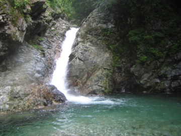 | 梅雨真っ只中。。入渓日の天気予報は日に日に降水確率が上がっていく(;◇;) 南海上に発生した台風3号も気になる。。 「本流やし水噴いたらどうにもならんなあ・・・」 まあ、とりあえずは行くだけ行ってあかんかったら他に転進しようってことで決着。 雲の切れ間に見える七夕の月を見上げながら吉野へクルマを走らせた。 午前3時に「道の駅 杉の湯川上」でやまとさんと合流。 最新の予報では初日のお天気はもつとのこと! これだから梅雨時の天気はわからん。 いい方向に変わってくれてラッキーだ♪ 弥山への登山口にあたる行者還トンネル西口に僕のクルマをデポしやまとさんのクルマで小谷川林道に向かう。 小谷川林道をどんどん進んで行き西山観音への分岐を左に見てそろそろ大栂山への登山口があるはず・・・ わからん(>◇<) うろうろうろうろ・・・ 地形図とにらめっこしながら30分ほどロスタイム。。 最終的に地形図の道とは合わないが登山道らしきものを見つけたのでこれに乗っかることにした。 ようは稜線にさえ出たらいいのだっ!! 最初は斜面をトラバース気味に進んでいくが途中に分岐があったので山に登って行く方の道を選ぶ。 植林帯の中をどんどん登っていくとモノレールが出て来た。 「これに沿って登ったら稜線に出るやろ」ってことにし、登山道?から離れてほぼ直登ラインで続くモノレール横を登っていく。 しかし、この直登ラインが急で急で朝から大汗をかかされる(T-T; やっとたどりついた稜線にはしっかりした林道がついていた。 どっから繋がってる林道かは深く考えないことにしよう。。 しばらく林道を大栂山方面に歩いていくと白川又川方面に分岐する林道があるのでそっちに入る。 こちらの林道は荒れて荒れて落石だらけで途中で崩れて寸断したりしている。 フジノトコに下りる道があるはずなのでそれを探しながら歩いていると何番目かの尾根にしっかりした踏み後があった。 よしっ!これにしようってことでその踏み後に入る。 このあたりはとてもいい加減(^o^; だいたいいきあたりばったりなのだ。 最初は尾根沿いにどんどん下る。 しかし道は尾根を離れフジノトコと逆方面に進むようになる。 少し心配になるが白川又川のどこかに出たらいいかってことで下っていく。 この斜面にはヒルが時々顔を覗かせた。 どんどん下ると立派な廃小屋があった。 そこからさらに下っていくと道は白川又川に沿ってフジノトコ方面に進むようになりひと安心♪ 適当なところで河原に降り立つ。 水は多いのか少ないのか普段を知らないからわからないが遡行には問題なしの水量だ♪ 白川又川は澄んだ水と白い河原がとても美しい。 しばらく渡渉を繰り返しながら進んでいくと両岸狭まり淵になっている。 ここは泳がなしゃあないので泳ごう。。 水は想像以上に冷たい。 なんでこんなに冷たいの?? そこからはもう泳ぎまくり(>◇<) ここってそんなに泳がなあかんかったん?? このあたりの事前研究はほとんどしてないので服装は泳ぎ仕様にしてこなかった・・・ 寒い寒い(;◇;) やまとさんに至ってはTシャツやしw(・O・)w ブルブル震えながら泳いでいくうちに左から中ノ又谷が釜を持った5m滝で入ってる出合に来た。 ここはおとなしく左岸を巻いていく。今回に限っては高巻きのねっとりする暑さがとても心地いい♪ それもつかの間、再びばしゃばしゃブルブルの世界に入りこむのでした。。 |