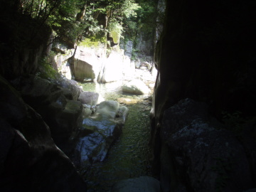 すぐ出てきた堰堤を左岸側から降りると両岸が立ってきてゴルジュ地形に変わる。