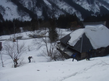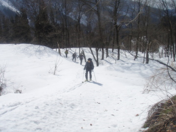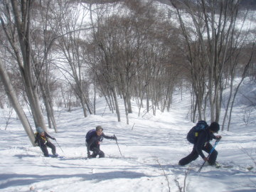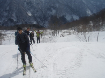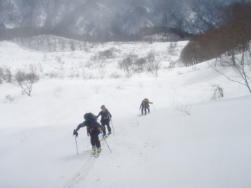 | 今週は小谷温泉付近で遊ぼうと大阪からはるばる出てくるが天気はあいにくの雨模様。 朝になってもなかなか止まない雨に意気消沈気味。小谷温泉から登ろうか大草連から登ろうかうろうろ。 結局、大草連の集落で雨が止むのを待つことに。 10時ころになると雨もあがってなんとなく青空も見えてきたので準備開始。 ゆうべからの雨で雪質はまったく期待できない。 大草連は初めてなのでどっから登っていいかまったくわからんがとにかく歩きだす。 集落内の棚田っぽい地形をどんどん登っていく。なんとなく登山道らしき切り開きを進むと林道に飛び出た。 そこにはいっぱいスキーのあとがついている。ようわからんが出発場所は間違ってたようだ。 とりあえず林道をだらだら登っていくとだだっぴろい雪原に出た。 しかし藪が目立つ。あと2、3m雪が多かったら気持ち良いオープンバーンになりそうだ。 今年はどこも寡雪で行く場所に困るくらいなので滑れるだけましか。 空は青空が見えていて太陽も顔出している。まるで春山のような気温だ。 雨で多量に水分を含んだ雪はぐさぐさで滑りが思いやられる。雪原をしばらく登ったあとは左の台地に乗りあがる。 急斜面をジグをきりながら台地状に出ると疎林の気持ち良い斜面になる。しかし雪が少ないのと悪雪は変わらない。 この斜面を登り切ると稜線に飛び出した。稜線があいにくのガスの中で風も強い。 春山から一気に冬山に戻った感じだ。稜線を西へ少し歩くと大渚山(1566.3m)のてっぺんに到着。 てっぺんには大渚山展望台と書いてある小屋があるが中には入れなかった。 ランチを食べてから滑降準備。先ほど稜線に出た地点まで戻り滑り出す。 予想通り滑りには難儀な雪質だ。気温が高いのでモナカになってないのが救いだが。 みなケガのないように慎重に滑り降りていく。基本登路を外れないように滑って行き雪原まで戻る。 雪質がよければ気持ち良いだろう雪原もここは我慢のターンでこなす。 林道をひと滑りし最後は棚田地形を苦労しながら駐車地まで戻って終了。 今日は滑りは快適ではなかったが雪山は楽しいことに変わりない。 みなさん楽しい1日をありがとう♪ |