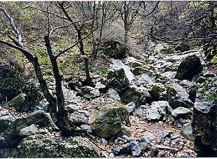 | 登山口を過ぎると谷は伏流となり岩がごろごろした景色に変わる。朝降っていた雨で岩が滑りやすくなっている。 一ノ谷、2ノ谷、3ノ谷と順番に過ぎて行きようやくうるしが滝に到着。滝の見える広場で一息いれる。 |