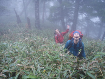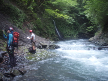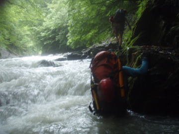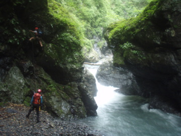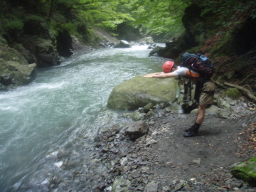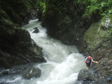 | 明け方寒くて眼が覚める。シュラフカバーだけでは心許なかったか。 まずは気がかりの水量チェック。残念ながら水量は5cm減った程度だが濁りは白濁から笹濁り程度までになっていた。 今日は核心部の通過になるがこの水量でどこまで進めることやら。 歩きだしてすぐに大沢出合。左から豪快な滝になって落ちている。 しばらく進むと前方に4m滝が見えてきた。この水量だと4mと言えども豪快だ。 ここは左壁の溝から高巻くことにする。 けも氏がロープを引っ張ったが一部脆い乗り越しで苦労してるのでショルダーでフォローする。 滝上に出ると徒渉が待っていたが真下の4m滝が怖いのでビビりながら渡る。 相変わらず水際のへつりばかりで進んでいくと今度は1m滝。この爆水ではどうにも出来ず右から高巻きする。 この先からいよいよ逆さの部分に入っていく。地形図でも顕著な蛇行はこの谷名の由来となった場所らしい。 逆さの中は延々廊下が続く。そして現れたのは両岸が1.5〜2mほどまで狭まった不通(とおらず)だった。 この最狭の廊下の中を圧縮された水が流れて来る。にゅで氏が果敢に挑戦するが笑顔で降参し戻ってきた。 ここは左の壁から巻くことにする。ここもけも氏がロープを引っ張っていく。 40mほどでピッチを切りあとはトラバースで最狭部を通過。懸垂2回で川床に戻った。 その後も右へ左へと蛇行しながら廊下が続いていく。水が多いので延々へつりか壁際をずりずり進んでいく。 逆さの最先端部分にくると左から3段の滝が落ちていた。 逆さ後半戦もどこまでも廊下が続いていく。水際を行けないところは小巻しながら進む。 水が多いので思うように進めない。時間ばかりが過ぎて行く。 いつ果てるともない廊下だが壁は低く圧迫感はない。しかし進んでも進んでも終わらないのでもう堪忍して〜 やっとのことで逆さの根元部分までただりつく。右から支谷が入り谷が西へ向くと豪快な5m滝が出てきた。 この5m滝を左から越えると廊下帯も終わり穏やかな河原が続く。緊張から解かれてリラックスタイムだ。 右から合地沢が滝で入りしばらくすると再び不通が登場。ここは右から高巻く。 トラバースしているとそろそろ林道が降りてきてるのか人工物やごみが目立ち始める。 ケモノ道を使ってトラバースしていき川床に戻る。(高巻き25分) その後は段丘上の河原が随所に出てきてどこでもテン泊出来そうだ。僕たちは左からアケ河内が入る二又で終了とする。 服装チェックすると本日もみんな山ヒルをアクセサリーにしていたようだ。どうしても高巻きするとついてくる。 にゅで氏は昨日とは反対の足をやられていた。 居心地の良いテン場でリラックスしていると夕立が降り出した。あわててツエルトにもぐりこむ。 さっきまで笹濁りだった水は一気に茶色い濁流になった。川を見ながら悲しい気分になる。 アケ河内からはきれいな水が流れているのに徒渉できないので汲みに行けない。 悲しいかな今晩の夕食は泥水で湯掻いた稲庭うどんを泥水で溶いたダシで食べた。僕たちはこれを泥庭うどんと呼んだ。 にゅで氏がひとり一匹ずつ塩焼き用と刺身用に一匹あまごを釣ってくれたので今日はたんぱく質にありつけた。 脂がのってておいしかった。 |