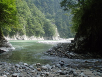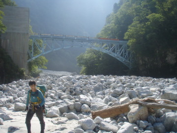 | 9月の飛び石連休の谷間に休みが取れたので4日間の日程がとれた。 4日間あるので今年の黒部はどこに行こうかと大ちゃんとやりとりしているうちに台風接近。 どうやら土曜日は潰れそうな感じなので残りの3日間で完了できそうな谷を捜す。 ぎりぎりまで悩んでいろいろな候補の中から名前のあがっていたサンナビキ谷に決定。 ここは谷名が魅力的なので前々から気になっていた。 さてサンナビキ谷と言えば出合が出平ダムに沈んでしまって入渓が困難とのこと。 大ちゃん情報によると今はバックウォーターがだいぶ土砂に埋まっていて、もしかしたらうまい具合に入れるかもとのこと。 さもなくば山越えでの入渓になるので雨の土曜日をアプローチで使えるかなと考える。 しかし台風一過の前日に天気予報ががらりと変わり土曜日は晴れに変わる。 その後もそんなに悪くはなさそうなので予定通り突っ込むことにする。 計画では中間部ゴルジュを越えたあたりの右支谷を詰めて駒ケ岳まで上がり僧ヶ岳経由で林道に降りる予定だ。 なので最初に1台僧ヶ岳林道を登って登山口にデポする。もう1台で宇奈月に移動し黒部峡谷鉄道で鐘釣駅を目指した。 久しぶりのトロッコ電車で観光気分。天気は予報通りの晴天、名のある谷を眺めながら気分よく進む。 トロッコ電車が出平駅を通過するころから黒部川左岸を注視。一瞬だけ見えるサンナビキ出合を確認するためだ。 バックウォーターに差し掛かるとそれらしい谷間が見えてきた。 大ちゃんの話しの通りだいぶ土砂に埋まっていて出合まで歩いていけるのを確認。ホッとひと安心。 喜んだのも束の間今度は本流の水量が今までの比じゃないくらい多くなっているではないですか。 一気に不安になる。はたして徒渉は可能なのか・・・ 不安をよそにトロッコ電車は鐘釣に到着。河原にある鐘釣温泉の露天風呂まで降りてから出発準備。 まずは水量少ない黒部川をらくらく下っていく。 不帰谷、似合谷、猫又谷の出合を見ながら下ると本流左岸に黒二発電所が見えてきた。 しかし広い河原でこれだけお天気だと暑い暑い。すでに両腕日焼けしてしまった。 さて問題はここから。黒二発電所から滔々と水があふれ出している。 最初は右岸の河原をらくらく進んでいくがいよいよ左岸に徒渉しなければいけない場所に到着。 うろうろとポイントを探すがここぞという場所が見つからない。 少し流れがきつそうだがなんとかなりそうな箇所でまずは大ちゃんがロープを使って泳ぎ渡る。 次に僕が流れに飛び込むがロープ渡渉がうまく機能せず少し流されながらなんとか左岸に移動。 しかし流されるとき左膝を強打。これが最後までひびいてくる。 左岸に渡ってしまえばあとは徒歩でらくらくサンナビキ谷出合に到着。 出合すぐに両岸が立って3m滝がある。ここで遡行準備をしていよいよ入渓。 3m滝は右から高巻いた。その上も谷中に圧迫感はないがまさに黒部な高い壁が続いている。 出合から続く下部廊下は快適に登っていける。どんどん進んでいくと右から枝谷が30m滝となって落ちている。 そこからすぐに2条滝で行き詰った。しかし右奥に2段滝があり全部で3条5m滝のようだ。 |