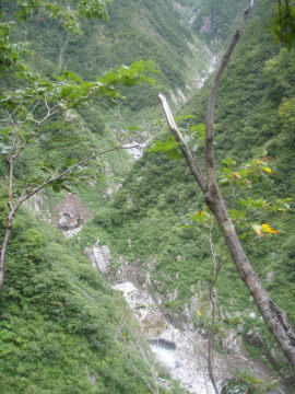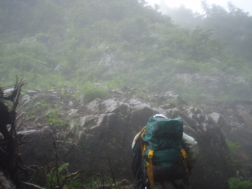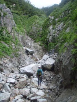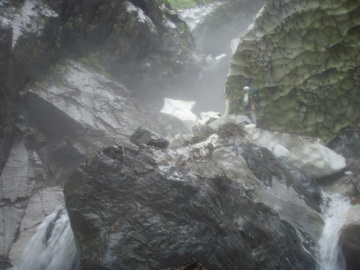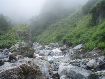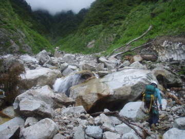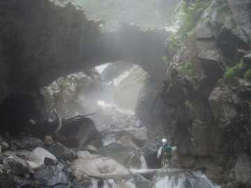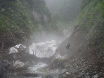 | ここは左の2条は問題外。可能性のあるのは右端の2段滝だけだ。 大ちゃんが昔ゴムボートでダム湖は渡って入渓して途中までいった時にはショルダーで登れたらしい。 しかし今日の水量ではそれは難しい。ロープを出して大ちゃんが右壁に取りついた。 そのまま1段目上に降り立つと2段目は倒木を利用して滝上へ登る。さすが大ちゃん。 僕はロープを使ってなんとか滝上へ。やれやれ。 その後はまた快適に登っていく。すると前方に大きな滝が見えてくる。3段30m滝のようだ。 これは無理なので右から高巻く。高く上がり過ぎてしまい最後は懸垂で滝上へ降り立った。 その上も廊下状は続くが谷中は大岩が積み重なっていてどんどん傾斜をあげるので疲れる。 しばらく登っていくと10m滝がありその上に取水堰堤が見えている。 振り返ると完全なV字渓谷でまだ黒部川右岸の山が近くに見える。 取水堰堤は壊れていて水も取っていないようだ。なるほど以前より下部の水量が多いはずだ。 このころから雨がザーザー降り出した。今日は晴れのはずだが・・・ どういうこと!? すぐに出てくる10m滝は左の大岩から乗り越えていける。 その後も大岩の積み重なった地形が続くが、途中あった岩小屋で雨宿りしながら雨脚が弱まるのを待つことに。 20分ほどぼんやりしていると雨が弱くなってきたので行動再開。2段滝を左から巻き上がると下部廊下を抜けて河原に変わった。 しばらく河原を進んでいくとふたたび谷幅は狭まるがとくに難しいところはない。 水量は雨でやや増水し濁っている。下部廊下通過中に降られなくてよかった。 再び開けた地形に変わると二股になっていて本谷は右俣。これ以上進むと中間部廊下に入るので今日はここで終了。 二股を過ぎてすぐのところにテン泊に適した場所があったのでそこにシェルターを張った。 すぐ先で川霧とは違ういやな霧がかかっているのでみて見るとやはりスノーブリッジの冷気によるものだった。明日が思いやられる。 しかし睡眠不足もあって止まない雨にどんよりした気分で寝入ってしまった。 |