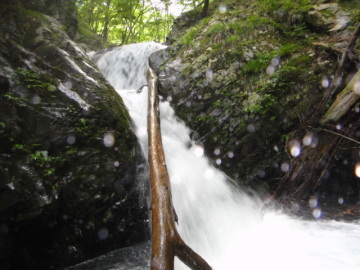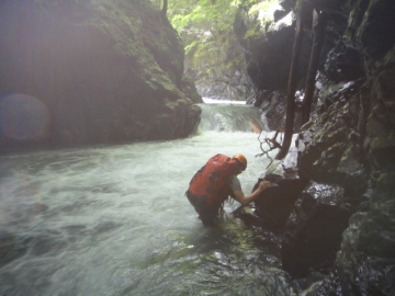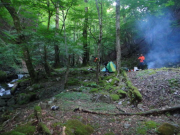 | 対岸に流木が横たわっている。まずはにゅで氏が流芯を飛び越えて流木を利用して渡る。 続いて僕も渡るが流木にハーネスがひっかかって身動きとれず半泣きになるがなんとか対岸へ。 あとの3人も無事に渡り終える。一回の徒渉でもかなりお疲れモードだ。 引き続きゴルジュが続く。釣り師が良く入る谷なのか途中にFIXロープがあった。 その後もひやひやモノの徒渉を繰り返す。いよいよへつりでも徒渉でも進めなくなると高巻きで進む。 壁が高くないので助かるわあ。川床に戻り、少し進みまた行きづまって高巻きし今度は懸垂下降。 しかしなかなかゴルジュは終わらない。すでに時刻は13時を過ぎている。 思った以上にペースが遅い、本日は三俣手前まで予定していたが、そこまでたどり着くことは無理そうだわ。 その後もみなへつりで落ちて流されかけたり、僕は釜の渦に巻かれたりしながらゆるゆると進んでいく(@◇@) 14時前になってやっと南沢出合に到着。このあたり吊橋跡があるらしいが見つけられなかった。 少し開けて河原状に広がるが相変わらず水勢が強い。 水に強いはっしーが流芯を飛びこえて徒渉。同じようにやってみろと言われても・・・ 残りのメンバーもヨレヨレとついて飛んでいく。 再び両岸が狭まり立ってきた。 またですか? いいかげん厭になってきたのだ。 流れに逆らいながらずりずり進んでいくと前方にとても越えれそうにない1mの段差。 あれは無理だわ。するとまたまたフィックスロープがあったのでありがたく使わせてもらい高巻き。 再び川床に戻りずりずりと壁際を進んだりへつったり。 すると今度は3m滝が登場! どないもこないもあきませんなあってことで左から高巻き。(高巻き10分) 再び川床に戻りゴルジュを進んでいく。しばらくすると右から水場ノ沢が入って来る。 すでに15時をまわっている。そろそろ今日のテン場を探さないとねえ。 谷は壁がなくなりところどころ河原が出てくるが何回か徒渉が出てくる。 すると標高800mくらいでちょうど良さそうなテン場が出てきたので本日の行程を終了。やれやれですわ。 距離にして予定の半分くらいしか進めなかった。これで帰りの上西河内下降の案は無くなったのでした。 装備を解くと出てくるわ出てくるわにょろにょろと。 今回は全員マイ虫除け持参なので皆殺し大会となる。 タープを張って焚き火の用意をしてしまえば水が多かろうがいつもと一緒。 にゅで氏の釣りあげたあまごの塩焼きを食べながら楽しいひとときを過ごす。 快適なスペースだがヒルには若干注意が必要なり。焚き火にあたりながらにゅで氏とはっしーが血を吸われていた。 |