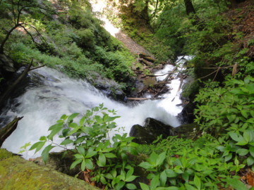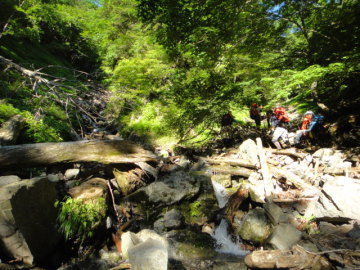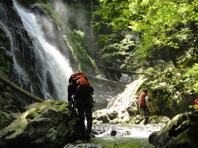 | 翌朝も快晴。昨日から7〜8cmくらい減水してるか?? 6時半くらいに歩きだす。さてさて、今日はどこまで進めるだろう。 相変わらず水勢は強いので壁際をずりずりと進んでいく。 しかしポイントを選べば昨日より徒渉はだいぶラクになった。 30分弱で前黒ノ沢が左から出合う。ちょうど谷が右に屈曲するところだ。 ここは右岸から進めないので少し戻り左岸に徒渉してからから進む。 対岸から前黒ノ沢を見ると奥に立派な2段50m滝が架かってるの見えた。 そのまま谷はゴルジュに入る。左の高い壁から一条滝が落ちている。 その先で谷通しで進めなくなり右から高巻いて行く。 いったん川床に戻るが今度は前方に5mのゴルジュ滝。あれはまったく歯が立ちませんわ。 再び右から巻き始めるがちょっと斜度があるので念のためロープを出して登る。ここが唯一ロープを使った登りだった。 30mくらいで壁上に出たのでそこからトラバース。懸垂下降で川床に戻る。(高巻き50分) 降りたところはゴルジュのど真ん中。進むにはまず徒渉しないといけない。 けも氏とこやぶんと僕は丸太を渡って移動。はっしーとにゅで氏はロープで徒渉した。 さて、その先もやっかいな場所が続く。白泡の沸く釜をへつり越え壁際をずりずり進む。 左岸に徒渉すると先で再び両岸が狭まる。はっしーが様子を見に行くが断念して帰ってきた。 ここはそのまま右から高巻き開始。ザレザレの斜面をトラバースしていく。 途中から川床を見下ろすと到底無理な渓相だった。 結構大巻きになってくる。途中リッジを登ったりしながら巻いて最後は懸垂で川床に戻る。(高巻き1時間) 降りた場所は右から小枝沢が入っている。ここで小休止。時間はもう10時だがやはり距離は稼げていない。 その後もゴルジュが続いていく。右からの小枝谷を見送り、なおもゴルジュを進んでいく。 もうゴルジュはお腹いっぱい状態。少し減水したお陰で岩が見えてきたので飛び石が出来るだけ徒渉がラク。 右から丸盆ノ沢がゴルジュ状で入ってくる。その後しばらく進み左から高巻いていくと谷が河原状に変わる。 左から支谷が入るところで懸垂で川床に戻る。ひさびさに穏やかな景色が広がる。 すぐに右から水量の多い枝谷が入る。地形図で標高1000mあたりだ。 このあたりはしばらく平凡な渓相が続く。徒渉もラクラクだ。本来は初日にこのあたりまで来る計画だった。 12時になったので河原でしばしお昼休憩。お天気も良くてのんびり気分に浸る。 ヒルチェックをすると、やはりけも氏は血を吸われていた。あれだけ高巻きをすると付いてくるなあ。 他の人も数人ぶらさげているが実害はなし。 河原状をどんどん進んでいく。左から滝で枝谷が入る。だんだん両岸が狭まってきた。 再び左から滝で枝谷が入る。本谷もゴルジュに突入。しかしそれほど難しいところはない。 どんどん進んでいくといよいよ三俣に到着。 左股は30m滝が豪快に落ちている。中俣も50m斜瀑が奥に見える。 本谷である右股はゴルジュ状になって一番手前に入って来る。 晴れてるから明るいがお天気悪ければ陰惨とした場所だろうねえ。 我々は本谷の右股に入る。入り口のゴルジュは左から巻いて行く。(高巻き10分) 川床に戻ると目の前に5m滝。左から越えて次の10m斜瀑は滝身右の斜面から登る。 落ち口上から先を眺めるがこの水量ではちょっと無理っぽい渓相が続く。 |