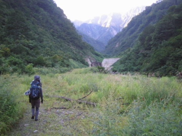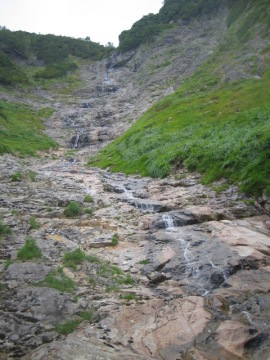 | 斜めのテントではやはり熟睡は不可能だった(;◇;) 足の力を緩めるとずるずる滑っていくのです。。 てわなけでいやでも5時には外にでて焚き火にあたっていた。。 のんびりと朝ラーメンを食べて出発準備。 まずはいきなり幣の滝を登る。 最初は水流右をフリーで登り、途中のテラスからロープを出す。 さてさて今日のトップバッターはだ〜れ。。 みんな遠慮し合う中でヒロタさんがトップを買って出る。 おとこまえっ!! 理由は次のピッチの方が難しそうやから・・・ でも僕なんてはなからモチベーション低し。 物見遊山気分できてるのでやる気なし(^−^ゞ スピード化の為、次に登るmoto.pがもう1本ロープを引きずりながら登っていく。 ビレイ点で引っ張っていったロープを固定したら残りの3人がヨロヨロ登っていく。その間にmoto.pが2P目を登るというスタイル。 なんとお気楽極楽なシステム(後続の人には・・・) さてさて2P目は水流を左に渡って落ち口へ。 でかい滝なのでロープ伝って登るだけなのに息がきれる(>◇<) 5人いてると何かと時間がかかるがワイワイとみんなで楽しく進んでいく。 滝上から少しゴーロ帯を歩いていくと左に曲がって25m滝。ここは左岸から巻くが登りすぎてハマル(T◇T) なんとか川床にもどり8m滝を簡単に越えると正面はルンゼで行き詰っていて右手から白龍の滝40mが落ちている。 手前の岩間滝をよっこらしょっと登って滝下へ。 moto.pは直登せーへんて言うてはったけど取り付きから見あげるとけして巻きルートと違うんちゃう?? 最後は右のブッシュに逃げるけどこれはほぼ直登ルートやん! どーみても実際の巻きルートは100mくらい戻った緩斜面から取り付くんちゃうん・・・(・◇・)/ 当然ここはmoto.pが責任をとってトップで登らされる。 ルートの試行錯誤はあったが最後は微妙な感じの壁をザックを背負ったまま確実に登っていかはる。 さすがに大したもんだ。 ハングを左から回り込んで潅木でピッチを切る。 僕はロープを張ってもらったにもかかわらずヒーヒー言いながら登るしまつ。 潅木帯から藪をこいでテラス状までが2P目。そこからモンキークライム&藪こぎで落ち口に出た。 白龍の滝上は明るい感じ。すぐに二俣があり僕達は右俣の祓川に入る。何故に枝沢が川なのかは不明。 すぐに大滝250mが目の前に! これはすごいなあ〜w(・◇・)w ここはロープなしでどんどん登っていける。 あまりにでかいので途中で息が上がってくるし(>◇<) 最後は左の藪に突入して笹薮をこいで滝上に出る。 もうそこは源流地帯。 しかし時間が大幅に予定を越えている。 時計はすでに14時前をさしていた。 のんびりしてたら僕が大阪に帰れなくなるので下山予定の鉱山道尾根ってところをやめて十字峡に降りてタクシーを呼ぼうかとなる。 しかしタクシーを呼んでる時間ももったいないので鉱山道尾根を使ったことがあるmoto.pとナンチャンの獣系チームは車を回収して 残りのメンバーは一般道で十字峡に下りる作戦をとることに。 鉱山道尾根チームの荷物を一部分担したあと獣の二人はさっそうと走り去っていった。 そういう僕たちものんびりはしてられない。 最後の詰めを足早に進んでいくと三俣が出てきた。 ここで水量の多い左俣を選択して大間違い(T◇T) 正解は右俣でした。 しばらく進むと間違いに気づいて草付き斜面から登山道を目指すが猛烈な笹薮に大苦戦。 僕は途中でメガネを弾かれて半泣きになる。 なんとかメガネは見つかったがなくしていたらどうなったことやら。 へろへろになりながら登山道に飛び出る。 そこからは中ノ岳までヒーヒー言いながら登る。 中ノ岳避難小屋の横を通り過ぎて中ノ岳(2085.2m)の山頂へ。 残念ながらガスで展望はきかない。 時間は16時を回っている。 ここから十字峡までエアリアのコースタイムで5時間半くらい。 そんなにはかからないと思うけど日暮れのとの競争だなあ・・・ とにかく早足で下りにかかる。 少し下るとガスが晴れてきてまわりの山々が見えてきた。 睡眠不足が今頃襲ってきてクラクラする。 こうなったらスピードを落としても慎重に行動しないと。 最後の30分ほどはヘッデンのお世話になったが無事に2時間強で十字峡に到着。 さすがにmoto.pとナンチャンはまだ到着していない。 あたりまえか(^-^; 真っ暗な十字峡小屋の前でお茶を飲みながら待っていると20時前に鉱山道尾根チームがクルマでやってきた!! これで無事に大阪に帰ることができます。おまけに温泉入って念願の魚沼コシヒカリ米も食べる時間が出来ました♪ みなさんありがとう☆ 楽しい2日間を過ごす事ができましたっ!! |