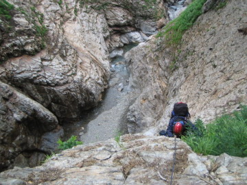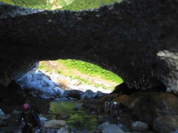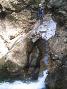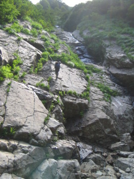| 40m懸垂下降で川床に戻る | 巻けば済む話なのに行っちゃうのねえ・・ |