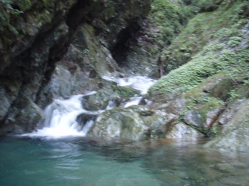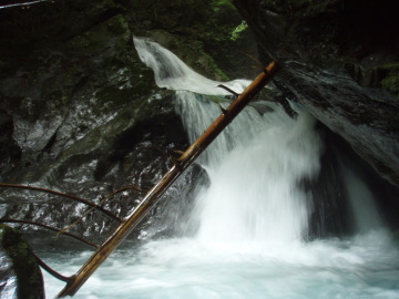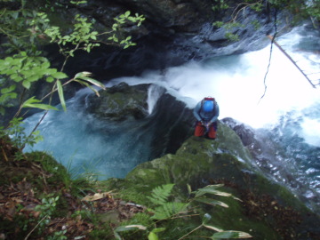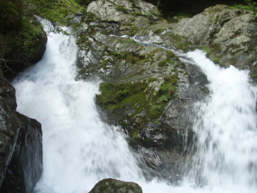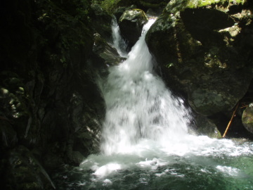 | ゴルジュ内連瀑は左から高巻いた | 奥の15m滝は左壁を登る |