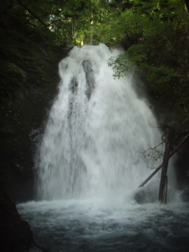 | どんどん上がっていき適当なところからトラバースに移る。 川床に戻ろうとしたら目の前にどうしようもなさそうな2段10m滝が豪快に落ちている。 川床に戻るのはあきらめて再び高巻き開始。 またどんどん上がっていき、また適当なところでトラバースに移る。 さて降りようと思うとまたまた10m滝が・・・ 再び巻いてやっと落ち口に降り立った。高巻きに40分くらいかかった。 大岩をくぐって穏やかな渓相の中をのんびり進む。左手から湧き水が滝となって落ちているところを通過。 すると前方に人影が・・・ 近づくと釣り師のようでちょうどお魚を釣り上げた瞬間だった。 ごきげんの釣り師に僕達は本谷に入る旨を告げて先行させてもらう。 すぐに右から15m滝が落ちていて直進方向は壁が狭まりゴルジュ状になった支谷が出合う。 この右手の15m滝が本谷で前方のゴルジュは馬の鞍谷のようだ。 僕達は本谷を行くので15m滝の右斜面にとりつく。滝の途中で右の藪に逃げて落ち口へ。 落ち口に上がると立派な仕事道が通っていて拍子抜けた。 しかしすぐ目の前には2段30m滝が登場して感動。 すばらしい景色なのでここでランチタイムにする。 滝上には10m滝が続いていてとても立派な滝だ。 太陽もさしてきてとても気分のよい空間だ。 パンとおにぎりを食べて重い腰をあげる。この滝は右岸のよく踏まれた仕事道を利用して高巻いて行く。 食後の急登はつらい(>◇<) ヒーヒー言いながら登る。適当なところで仕事道を離れ川床に戻った。(巻き所要時間15分くらい) 滝上からは廊下が続き快適に直登できる4mくらいの滝が連続する。 右から枝谷が小滝で入るのを見るとすぐに5m滝。これは登れないので右から巻いた。 このあたりも滝が連続して飽きることがない。しかし、二人ともそろそろヘロヘロ気味だ(>◇<) しばらく進むと両岸が狭まってきてゴルジュ状になる。 そのままゴルジュ内に入ると谷は一気にV字状になりその中に小滝が連続する。 つっぱりで進んで奥を覗くと出口の5m滝が抜けれなさそう。左の壁から巻いて5m滝の落ち口に懸垂で降りた。 その後も10m滝が2本続く。いいかげん勘弁してくれモード。しかしまだ勘弁してくれないらしく滝が続く。 最後に15m滝を左壁から越え、少し行くと二俣に到着した。 左岸には植林小屋があったであろう台地がある。 ここはクルマをデポしてある経ヶ峰に近い左俣を選んで進む。このあたり谷はとても穏やかになっている。 この頃に雨が降り出し、雷も鳴り出してどんどん雨脚が強くなる。 なんとなく厭戦気分も高まりトユ状3m滝で踏ん切りをつけて右の斜面から稜線を目指す。 この斜面が植林の急斜面でヨレヨレになりながら登る。やっとのことで稜線に飛び出したところが大台ドライブウェイ!! ここで失敗。 なんとなく経ヶ峰の右側に出ると思い込んでたので、地形図も確認せず「ひだり、ひだりっ!!」っとお気楽発言。 大台ドライブウェイを行けども行けどもクルマにたどり着かない。 これはおかしい・・・ と気づくまで30分かかる(^^; 地形図を見ると思いっきり経ヶ峰の左側に上がっていた。 ドライブウェイを詰め上がった場所までもどり、そこから右に5分でクルマにたどり着いたのでした(;◇;) まっちゃんごめんなさい。 最後に失敗しましたが白倉又谷じたいはとても楽しいところでした。 下部の林道沿いもなかなかの美渓でとばすのはもったいないところです。 中間ゴルジュから30m滝はメジャーですがその上部も滝が連続してなかなか捨てたものじゃありません。 でも出合から詰めるとさすがに疲れました(>◇<; |