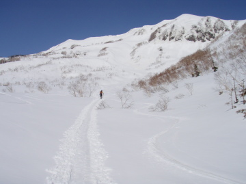 | 白馬岳とわたし | 白馬沢右俣の大斜面を滑る先行テレマーカーさん |