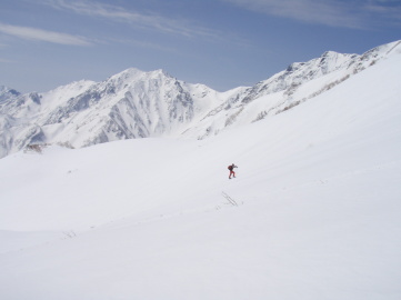 | 白馬沢と白馬岳 | 上部斜面を滑るMINMINさんと大ちゃん |