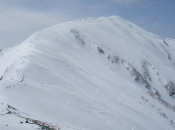 | 金山沢上部の広大な雪原を登る | 船越ノ頭から小蓮華山へ続く稜線 |