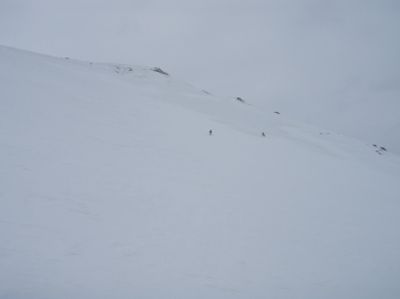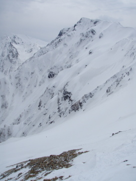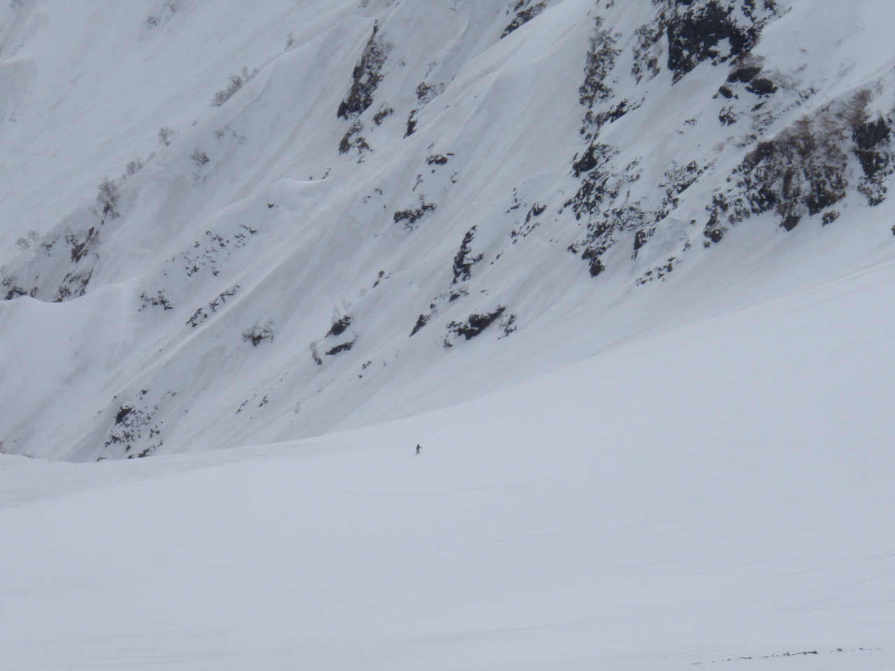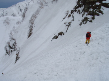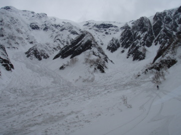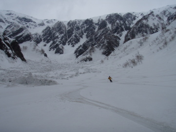 | さあ、僕たちも急がなきゃ。天気はどんどん下り坂のようだ。 風に煽られながら滑降準備をし、いざ出発♪ ウキウキモードで稜線から大斜面に滑り込むと・・・・・ モナカか(;◇;) これじゃあ広大な斜面が台無しだあ。 苦労しながら板をまわす。 みんなもヨレヨレで滑っている。 逆三角形の大斜面をヘロヘロと滑り降りるといよいよ核心部分への入口がまっている。 白馬沢はここから斜度が強まり代掻き馬の後ろ足に添うように落ちていく。 雪崩を警戒し一人づつ滑り降りる。悪雪に苦労しながら高度を落としていくと沢は狭まりノドの部分にさしかかる。 しかもこのあたりからデブリだらけ。足腰ガクガクになりながらデブリ帯を滑る。 まだ落ちきっていないブロックに注意しながらもデブリに乗り上げ一向にスピードが上がらない。 頭上の白馬岳主稜を見上げると稜線にテントが見える。 白馬岳の懐深く入り込んでるのを実感。 ヨレヨレになりながらも何故か気分がいい♪ 山スキーは楽しい☆ 左から小蓮華山の直登ルンゼを合わさるとすぐに右手に白馬沢左俣が合流してきた。 このあたりでやっとデブリから解放された。 雪質は極上のザラメ♪ いままでのうっぷんを晴らすように快適に滑る。 しかしポツリポツリと雨が降り出した。 先を急ごう。 白馬大雪渓が右手から合流するとすぐに白馬尻に到着。 金山沢にはたくさんのシュプールがついている。 林道に入ると猿倉まであっというまだ。 二股まで長い歩きを覚悟していたが1/3くらいはまだ除雪されてなくだいぶラクできた。 滑りを考えるといまいちでしたがこれも山スキーの醍醐味でしょう。 悪雪でも楽しいものは楽しいのです☆ 同行のみなさま素敵な1日をありがとう♪ |