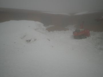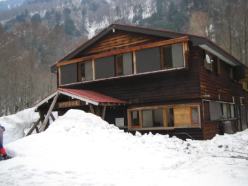 | 2005年ゴールデンウィーク!! 双六小屋をベースに滑りまくろうと計画♪ 今回はひさびさに単独での山行だ。 ゴールデンウィーク初日の早朝。新穂高温泉の登山者用駐車場に到着。さっそく準備をして歩き出す。 天気予報は午後から雨(T◇T) 今日はなるべく早く目的地の双六小屋に入ってしまおう。 新穂高のバスターミナルで登山計画書を出し左俣林道を登っていく。 穴毛谷を過ぎたあたりから雪道にかわるが雪は締まってるのでスキー板は担いだままで歩いていく。 さすがにGW ってことで僕と同じく双六小屋を目指す人が多いぞ。 わさび小屋でシール登行に切り替える。小屋から少し進むと林道から離れ小池新道に入る。 目指す大ノマ乗越ははるかかなたに見えている。。 いきなりデブリの洗礼。秩父沢周辺には幾筋ものデブリが出ていて歩きづらいったらありゃしない。 天候の崩れが早まっているのか稜線にはガスがかかり始めた。 デブリ帯を越えてしばらく登ると夏道の分岐付近。大ノマ乗越を見上げるがまだ遠いなあ。 雪が多い時は乗越に雪庇が出来て苦労するらしい。その時は弓折岳への尾根ルートをとるようだ。 で今回は・・・ ガスで見えない(T◇T) とにかく登ってみるか! という事でそのまま乗越を目指す。 どこからともなくヘリが飛んできて僕の頭の上を一回り旋回して去っていく。 なぜ?? だんだんガスが濃くなり雨がポツリポツリと振り出した。斜度も強くなり、少し登っては立ち止まって息を整えなければくるしい。。 弓折岳方面の稜線には雪庇が出ている。この雨で崩れるなよ〜と祈りながら登っていく。 最後の急登を越えるとガスの中の大ノマ乗越に飛び出た。乗越はやや雪壁状だったが雪庇までは発達していなかった。 真っ白で景色も見えない雨の中、パンをかじる。 ここからは稜線沿いに行く方法もあるが一旦双六谷に滑り降りてから双六小屋を目指すことにする。 シールをはがして滑降モードにチェンジ。滑り出しは急斜面の上ガスで視界が利かない。 不安な気持ちでゆっくりと滑っていく。少し下ると稜線にかかるガスから外れて下が見渡せた。 な〜んだ。すぐ下に双六谷が見えている^-^ どうせ双六谷は登らなければならないのでトラバース気味にあまり高度を落とさないように滑る。 双六谷に降りたったところでシールを貼り付け緩やかな谷を登っていく。 しかし再びガスの中に入りまったく先は見えない。地形図で現在地を確認しながら登っていく。 最終日に滑り降りてくる双六カールからの谷を左にわけて谷は少し狭まるがすぐまた広い雪原のようになる。 こうなるとまったく方向感覚が利かない^-^; 谷状の地形なので大きく外れることはないが視界がないとやはり不安だ。 稜線に近づくと風もつよくなりいっそう方向感覚が狂わされる。 それでもなんとか双六小屋に到着♪ 玄関にまわると雪で埋まっている^-^; 雨とガスの中しばらくあたりを右往左往・・・ 調理場らしき場所の戸をどんどんと叩いたら中から返事が! 今日は素泊まり用の炊事室の扉から入るようだ。荷物を降ろし小屋の中に入って一息。。 どうやら僕が今年最初の客のようだ^-^ 早く到着し過ぎたので小屋の人も油断してたみたい。 談話室で地図を見ながらぼーっと過ごす。夕方にかけてぼちぼち他の登山客も到着しだした。 やはり山スキーのお客さんが多く初対面ながら明日の計画など話あいながら楽しい時間を過ごした^-^ |