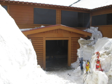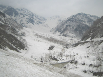 | モミ沢出合でシールを貼り付けて本日最後の登りが始まる。すぐに滝があらわれた。左岸をトラバースして滝上へ。 あとは延々と登っていく。 目の前に樅沢岳が聳えている。 こちらも楽しそうな斜面が見えている。 稜線が近づくにつれ傾斜もきつくなってきた。 最後はジグザグに登りながら小屋の西側斜面に登りきる。 シールを付けたまま小屋まで滑り込んで本日は終了^-^ 再び快適な小屋でひと晩過ごす。 談話室で今日の行程をみんなで話あったりして楽しい1日は暮れていく。 翌日は午後から雨の予報(T◇T) なんとか降られる前には新穂高に降りたいもんだあ。 今朝も双六岳への登りで始まった。 昨日は板を担いでアイゼン歩行だったが今日はシール登行にしてみる。 スキーアイゼンをつけての登りは快適快適♪ 今日も槍・穂高が良く見える^-^ とちゅう真っ白の雷鳥のお出迎えもあり気分よく頂上へ。 双六岳の頂上は昨日より風が強くあまり快適ではないが、最後の展望を楽しむ。 本日の1本目は双六カールの滑降だ。頂上から南側の斜面に飛び込む。 とても気分のいい斜面が双六谷まで続いてる。最後は幅が狭くなるがとても楽しい1本だった♪ 双六谷に合流しそのまま谷に沿って滑っていく。 正面に大ノマ乗越へあがる谷が見えてきたところで高度を稼ぐためトラバースに移る。 程よいところでシールを貼り付けスキーアイゼンを付けて登行開始。 大ノマ乗越を目指してトラバース気味に登っていく。 このあたりはどこも急斜面でスキーアイゼンがとても有効だ^-^ 大ノマ乗越に突き上げる谷に出るとあとはジグザグに登っていく。雪は悪くけっこうきつい登りで最後はへろへろになる。 乗越につくと休憩もとらずシールをはがして今回最後の一本に突入。 左俣林道まで続く大斜面だが、いかんせん雪質が悪すぎた。 体力の消耗する滑りだ。秩父沢が近づくとデブリ地獄の始まり。 ヒーヒーいいながら越えていく。いくつものデブリを越えて左俣林道に到着。少しでわさび平小屋へ。 ここからは途中ところどころきれていたが残雪を拾いながら穴毛谷出合付近まで滑り降りることが出来た。 下界はもう初夏の気温。暑い暑い。 空はどんよりしているがなんとか雨に降られる前に新穂高温泉に下ることができました。 |