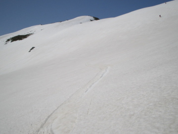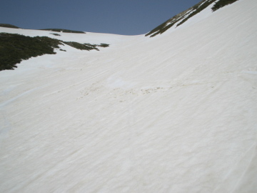 | さてさて、次はどこを滑ろうかな♪ 今回は黒部源流を滑りたかったので西方面を眺めてみる。 緩やかであまり面白いともいえない感じだ。 どうせなら最初の岩苔乗越から滑ろうと考える。せっかくなので鷲羽岳にも登っておこうと思い稜線沿いに岩苔乗越を目指す。 以前鷲羽岳に登ったときはガスでまったく景色が見えなかったので、今回はぜひ景色を見てみたかった。 稜線には雪がついておらずスキーは担いだまま頂上を目指す。 時々凍った雪が出てくるがほぼ夏道どおりを小1時間で鷲羽岳(2924.2m)のてっぺんへ。 反対側にいったん下り再び登り返したところがワリモ岳。頂上直下が雪壁で少し緊張したが無事に通過。 やっと行く手に岩苔乗越が見えてきた。 途中で岩苔乗越まで雪がつながってる場所に出たのでスキーを履いて一気に乗越に滑り込む。 さすがに黒部の最初の一滴の場所。感慨深いものはあるなあ^-^ ここでランチタイムとし、ココアを沸かしてパンをかじる。 のんびりとした時間を過ごしいよいよ憧れの黒部源流へ!! 斜度が緩いので滑りはあまり面白いといえないが、やはりここが黒部源流と思うとうれしい^-^ 途中からあまり高度を下げないようにトラバース気味に滑り三俣山荘を目指す。 気温の上昇で雪はグサグサ。だんだん滑りにくくなってきた。 三俣山荘には登りになるのでシールを貼り付けゆるやかな斜面を登っていく。 さてさて、ここから本日最後の一本。弥助沢の滑降に移る。 三俣山荘の横でシールをはがし、またまた滑降モードにチェンジ。 雪庇をさけて滑りだせる場所をさがす。 少し進んではここはあかん^-^; とか繰り返すうちによい斜面があったので飛び込む。 最初は少し急だが徐々に傾斜は緩まる・・ しかし、この暑さ! すぐに雪質はグサグサに。 苦労して登った弥助沢も滑るとあっというまに樅沢出合へ。 そのまま滑っていくと水流が出てきたので右岸をトラバース気味に進むとカタカナのモミ沢の出合に到着。 |