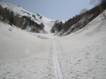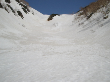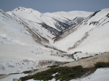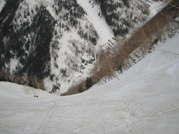 | 双六岳のてっぺんからひと滑りしたところ | 樅沢に入って振り返った景色 |