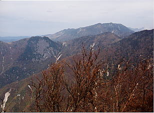 | 右手には大峰山脈の主稜線が見えている。その中でひときわ目を引く山が大日岳だ。しばらく歩くと前方に目的の釈迦ヶ岳も現れる。あいかわらず道は気持ちのよい尾根を行く。 |