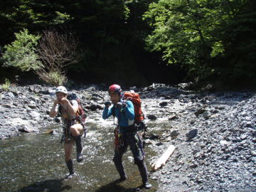 | 日が変わる頃から寒くて寝れなかった。さすがにシュラフカバーだけではだめか(>◇<) 薄明るくなったので4時には起き出してしまう。しかし谷中で迎える朝は気持ちいい♪ 今日も長い1日になりそうだが朝はだらだらとして準備が進まない。けが病人にゅで氏は朝から体調すぐれないようだ。 それでも7時半には出発。目の前の10m滝はちょっと登れない。右手ルンゼから巻き始める。 朝一からなかなか手強いルンゼの洗礼だ。けも氏が先行しロープを張ってくれた。 その後はなんとか登りきり適当な場所から谷側にトラバースしていく。 40m+40m+25mの懸垂下降3回で川床に降り立った。途中だれかが落とした赤いアブミが落ちているのが見えた。 つるりとした10m滝を右から巻いて滝上へ。続く釜を持った1m滝は左壁にトラロープがFIXしてあり使わせてもらう。 その後も両岸立ったゴルジュ地形は続くが難しいところはない。 8m滝はけも氏がシャワー浴びながら直登。僕とにゅで氏は左から巻き上がる。 滝上で谷は右に曲がり廊下になっており、左からは枝谷が20m滝で入っている。 またまた壁は高くなり何やら出てきそうな雰囲気になる。 するとやはり釜を持った5m滝とその先のホールに落ちる15m滝が見える。 これはだめなので右壁から高巻き開始。けも氏がロープを引っ張る。ずるずるのいやな登りだ。 2P目もそのままけも氏が引っ張って行く。がんばれけも氏! こちらもいやな感じの登りだった。 では3P目もそのままけも氏ってなわけにはいかなく今度は僕がロープを引っ張る。 ルンゼをトラバースして立ち木でFIX。後続に来てもらってる間にもう1本のロープで川床まで懸垂下降で降りた。 これでいったん出合から続いていたゴルジュ帯は抜け出たようだ。 両岸から樹林が降りてくる。ここからはスピードを上げてどんどん進んでいく。谷の中は小滝が続くがほとんど直登可能なものばかり。 しかし距離があるのでどんどんヘロヘロになってくる。今年初の沢泊まりなので荷物にカラダが慣れてない(>◇<) |