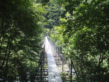 | 登山道横断点で雄叫びをあげるけも氏 | 最後の核心 中ノ宿吊橋 |