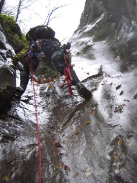 | 平凡と言っても両岸は高い壁に閉ざされてるのでエスケープは困難。ところどころに出てくる滝はどれもツルツルでひとくせある。 雨もいよいよ本降りになってきている。じっとしていると寒いのでとにかく進む。 そうこうしてるうちに再び両岸が狭まり怪しげな雰囲気に・・・ 井戸底ゴルジュに入りこんだようだ。 最初の滝は8m滝。下部はなにげにスタンスがあるが上部はツルツルっぽい。 井戸底ゴルジュとはよく言ったものでなるほど井戸の底から上を見あげてるようだ。。 乾いていたら持ってきていたクライミングシューズに履き替えてフリーで越えたいところだ。 しかし今日は雨降りでそんな気にならずここでもアブミのお世話に。。 最後だけ沢靴のフリクションを信じてエイッっと登りきる。 あとから登るやまとさんはハーケン回収が大変そう。 昔はところどころ残置があったようだが、今は懸垂支点以外ほとんど見当たらない。 つづいてすぐに7m滝がある。 ここは手前のクラックを人工で登るのがルートらしい。でも奥のツルツル部分もなにげに登れそうな感じ。 あくまで試しに登りはじめたらやまとさんのそのまま登ってしまえ!!って指令が出てしまう(><) ここも途中でアブミを出すはめに・・ 最後はランナウトでフリクションを信じておりゃ〜っと滝上へ。。 う〜んなかなか手強い滝ばかりだ。。 |