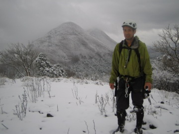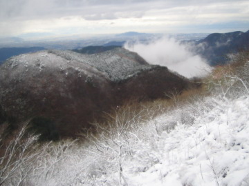 | 続く滝は・・・ 泥水釜つき(><) 膝下まで浸かりながらツルツルの滝に取り付く。 ここを越えたら井戸底ゴルジュも終了^−^ 再び平凡な渓相に。。途中の5m滝は左からバンド状を登る。 その先、壁が立ちはだかって行き止まりか!と見間違えるところが迷路ゴルジュの入り口。 谷は右に折れて6m滝の上からツルツルナメ滝が続いてるのが見える。ここはやまとさんがトップで登っていく。 ツルツルの3段25m滝を越えると深い釜に泥水を溜めた2m滝。 さすがにこれは浸かりたくない(><) 左岸から高巻いて懸垂で戻る。 どうやらこれでゴルジュ帯は全て終了したようだ。 しばらくすると水流が出て穏やかな渓相の中を歩いて行く。 しかし相変わらず雨が降っていて寒い。。 途中何故か人工的な石垣が一箇所だけ出てきて驚く。なんでここだけ?? そろそろかなあって頃に右岸の植林に踏み跡があったので谷筋を離れて斜面を登る。 稜線までどんどん登っていかなくてはならないのだが泥の斜面でツルツル滑って歩きにくい(><) 高度を上げるとなんと雨が雪に変わりあたりも白一色に。。 聞いてないよ〜(>◇<) 沢登りの装備で雪山を歩くことになるとは・・・ とほほ 冷たい寒い冷たい寒い・・・と呪文ように唱えながら登り続ける。 稜線に近づくと近江平野が見えてきて景色は美しい♪ すぐに茶野(938m)に到着。 下りは東側の斜面を適当に下っていく。 どんどん下ると夕暮れ寸前に国道306号に飛び出した。 結局1日中雨に打たれ続けた12月の沢登りでした。 寒かったです。。 |