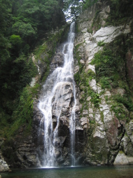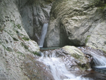 | 大きな淵の先にはま松滝4m?がかかる。 淵を泳いで右岸から登る。 さすがに盛夏、あまり水は冷たく感じない。 大岩の隙間があり胎内くぐり好きなかっきーは大喜びでくぐっていた。 つづく5m滝を越えて進んでいくと2段8mの銚子滝が! 流れのある釜に飛び込んで左岸に泳ぎ渡り滝の右壁を越えていく。 すると何やら銚子滝の奥に異様な半ドーム状にえぐられた壁が見えているやん!! あれがうわさの大滝か!! 大喜びで急いで見に行く(^-^)♪ 銚子滝上の淵を泳いでいくと右手から35m大滝が滑り落ちてるのが見えてきた!! 素晴らしい〜 あまりのスケールのでかさにかっきーと二人で感動♪ 滝を見ながらしばし休憩タイム^-^ さてさて見るのはいいがこれを越えなければ・・・ ここは左岸を高巻きする。 銚子滝のところまで戻り左岸にとりつく。 木や根っこをつかみながら順調にどんどん高度を上げていく。 すると壁が立ち塞がった。 壁を越えれる弱点を探しながらすこし左に移動するとかろうじて登れそうな場所が。。 そんじゃ登ります♪っとお気軽に少し登るが壁が立って身動きできなくなる^-^; 結局「かっきー!あかん、ヘルプミー」と叫んで立ち往生。 壁の途中でザックを下ろして受け取ってもらう。。 逆にかっきーからキャメロットを受け取りセルフビレイをとってほっと一息。。 ここでもアホまるだしだ^-^; 教訓 そういうことは登り出す前に考えること^-^; ロープを結んで途中のテラスまで1ピッチ登る。かっきーはアッセンダーで続く。 まだ壁は立っているがテラス左手から上に抜けれそうなのでここでも念のためロープを結んだまま2ピッチ目を登る。 ここでロープを解いてもうひと登りすると立派な登山道に飛び出した。 なんでこんなところにこんな登山道が?? まあ深くは考えないようにしよう・・・ すこし上流側に進み大滝の看板が出てるところから踏み跡をたどって沢筋にもどる。 降りた場所は大滝上の5m滝の落ち口だ。 2時間弱の大高巻きになった。 すぐに釜を持った5m滝。ここは右岸から巻いていく。 すると前方に大滝が見えてきた!? ように見えただけで、実は二俣の滝で見えてるのは支谷の滝らしい。 ここは淵手前のツルツルの岩を無理やりのぼり右岸から巻いていく。 簡単に巻けるかと思いきや間に深いルンゼがありどんどん追い上げられ結構な高巻きをさせられた。 |