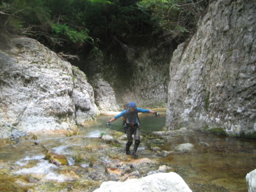 | 春に東京へ転勤になったかっきーがお盆の帰省で関西に帰ってくる。 てなわけで当然どこか沢に行こうってことになった。 するとかっきーがまだ立合川(たちあごう)には行ったことがないなあって事で行く先はすぐに決定^-^ 資料を調べるとなかなか楽しそうな谷だ♪ 基本的に所要日数は3日かかるみたいだがなんとなく2日で抜ける事も出来そうな感じ。 何かとお盆は忙しいので・・・ 一応3日分の準備をして出来ることなら2日でやってしまうことにする。 当日吉野で待ち合わせをし、まずは下山予定地の国道425号沿いの白谷トンネル東口にクルマをデポする。 続いて入渓点の立合川橋を目指す。 国道169号を北山村から十津川村に入ってすぐに目的の橋がかかる。 立合川のV字渓谷を跨ぐ立派な橋だが橋桁にはクマの銅像が座っていてなんだかかわいい♪ さっそく東野トンネル側のスペースにクルマを止めて入渓準備をする。 天気はくもり、二人とも睡眠不足でヘロヘロ気味だ。 6:30とにかく出発進行!! まずは沢筋に降りなければ・・・ バス停の横にハシゴがあり、それを使って降りる。 これが最悪(T◇T) ザックにつけてるヘッチンがひっかかってひっかかって降りるも登るもできないや〜ん! ヒーヒー言いながらアクロバティックな動作で抜けきった時にはすでになにやら達成感が。。 同じくかっきーが苦労してる姿を見てるとアホまるだしだ(;-;) 最初にヘッチン外したらこんな苦労せずに済んだはずだが・・・ あほ2名。。 少し下流方面に下ると旧道があった。道沿いに沢筋方面に下ると立合川を渡る吊橋がある。 その吊橋を渡り左岸側からやっと河原に降りる。 6:45入渓^-^ すぐに遥か上を通る立合川橋をくぐる。 橋下には不法投棄された石油ストーブが落ちていた。 あんな高いところからこんなん降って来たらたまらんわ。。 そそくさと通過^-^; いきなり両岸が狭まり淵が出てきたぞ。 しかし、ここ数日本格的な雨が無いのか水量は少なめのようだ。 岩についたミズゴケから推測すると平水位より5cmくらい少ないかなあ・・・ ちょっと残念。。 淵をジャバジャバ進んでいくとすぐに最初の滝が現れた^-^ これは、なべ滝3mかな? この谷は名前のついた滝が多いのだが資料ごとに微妙に場所が違うので僕も適当^-^; ここは左岸から巻いていく。 つづいてすぐにふじんぼ滝5m?が登場。 ここは右壁から越えれた^-^ 少し進むと大きな釜を持った滝。 これは、よりきや淵滝?? ビミョーに面白い名前が多い。。 出来れば由来を知りたいもんだ。 ここは右岸から巻いて行く。 滝上はナメ床になっていて明るくて気持ちいい場所だ。 |