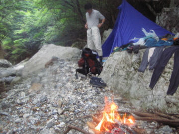 | 続く8m滝も直登不可能で今度は左岸から巻いていく。 すると両岸が狭まってきて淵が続くようになる。やや埋まり気味な淵を泳ぎをまじえながら越えていくと明るいナメ床に変わる。 とても気持ちがいいところだがツルツル滑るので気が抜けない。。 ナメ床に続く小滝をいくつか過ぎると河原になった。 このあたりはとても穏やかで気分が休まる場所だ^-^ 朽ちた吊橋をくぐりしばらく進むとこの谷最大のウシオ滝40mが登場。 ここは右岸からの高巻き。ここも登るにしたがい壁が立ってきて弱点を探しながら高度を上げる。 なんとか登れそうな場所が見つかったので立ち木を掴みながら空身で登り荷揚げすること2回で壁を乗越えた。 ここは30分程で滝上に出ることが出来た。 滝上からは大岩がゴロゴロ転がっているゴーロを通過し河原に出る。 しばらく単調な河原を進むと大釜を持った8m滝。 よく見ると流芯に太いワイヤーが垂れている。 あれ使えるんちゃう?? ってことで左から斜上するバンドに乗っかってワイヤーを手繰り寄せる。 強度が心配なので空身でチャレンジ! ひょいひょいと登る事が出来た^-^ だが、ロープを持ってきてない^-^; 持ってるだけのスリングをつなげて不安定な足場でのザックの荷揚げ・・ 体力・精神を消耗しました。。 これなら巻いたほうがどんだけラクか^-^; またまたアホまるだし。。 その後いくつか滝を越えるとゴーロに変わる。 ゴーロが終わると2段30m滝が立ち塞がったので右岸から巻いていく。 このあたりまでくるともうヘロヘロ。 沢筋に戻ったところに淵の奥に5m滝。 少し休憩を入れてから淵に挑む。。 ここは滝の左手を容易く登る事ができた。 滝上からは快適な河原が続き、この辺りで本日の行程を打ち切ることにした。 シェルターを張って焚き火をつけて夕食のパスタを美味しくいただきました^-^ 焚き火を囲んでだらだらしてると雷が鳴り出し夕立が降り出した(><) これを潮に宴会を打ち切って寝ることに。 明日もハードな一日になりそうだ。。 |