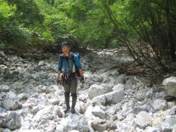 | 翌朝5時に目が覚める。 しかし朝のしたくはだらだらで結局出発できたのは7時過ぎ^-^; しばらく穏やかな河原を歩いて行く。 すると釜を持った5m滝。ここは左岸から巻き上がる。 落ち口に降りてしばらく先へ進むとまた釜を持った8m滝。 ここも左岸から巻き上がる。 次に出てくるのは釜を持った2m滝。 ここは右手の壁をスリングをアブミ代わりにして攀じ登る。 滝上からは次の滝との間にに倒木が橋のように架かっていてラッキー♪ このゴルジュは順調に越えていけると思ったのもつかの間。 奥に越えられそうもない12m滝が・・ 右岸から巻き始めるが壁にさえぎられてどんどん高度を上げていく。 そろそろいいかなとトラバースに移るとスッパリ切れてたりしてまだまだ上へ上へと。。 やっと壁を越えて登りきった岩尾根の反対側は急斜面だった。 歩いても降りれそうだが、安全をとって懸垂下降することにした。 小1時間かけてやっと沢筋に戻る高巻きだった。 少し進むと谷は左に折れてトユ状の滝が落ちている。ここは右岸から巻き上がった。 その上はなんとなく穏やかな渓相に変わり、「さすがの立合川も癒し渓になったなあ」とかっきーと話してると・・・ 両岸狭まりエグイ15m滝が右から落ちてるやん。侮りがたし立合川!! 右手のルンゼから巻き始める。 途中から左の壁を立ち木を掴みながらエテ登り。 ヒーヒー言いながら沢筋に戻る。 これで核心部は全て終了したのか、その後は伏流になり大岩のゴーロ帯をすぎると明るい河原が続くようになる。 このあたりが八丁河原のようだ。右手に崩壊した植林小屋をみてすぐに二俣になる。 ここでランチタイム。 パンをかじる^-^ さて、いよいよ最後の大詰めがまっている。 二俣を右にとり進んでいくと次第に傾斜がきつくなってくる。 地形図で確認し960mあたりで左の支谷に入る。 ますます傾斜はきつくなり、足取りも重くなるいっぽう。 するとついに前方に壁が立ち前進不可能となる。 ここは左の尾根に逃げることにした。 この巻きが笹の藪こぎでヒーヒー言わされまくり。 足取りは遅遅として進まず体力ばかり消耗する。 尾根に上がっても傾斜は緩まらずヘロヘロ状態。 しかし登るにつれて踏み跡はしっかりしてきて笹も低くなる。 なんとか稜線まで登りきると立派な道がついていた。 これは蛇崩山方面への登山道のようだ。 快適な道なのだが体力を消耗しきっての最後の登りがとてもきつく感じられた。 登りきったところが反射板の立つ笠捨山の東峰。そこからすぐに笠捨山の西峰(1352.3m)に登頂。 疲れきって特に感慨もあったもんじゃない。 展望も霞み気味だ。。 休憩しているとどこからか鈴の音がチリンチリンと聞こえてきた。 しかし、他の人の気配はまったくなかった。。 まあ、お盆やしこういう事もあるやろってかっきーと納得する^-^ ここからはクルマのデポ地を目指さなくてはいけない。 頂上をあとにして奥駈道を北に向かう。 疲れたカラダには尾根歩きのアップダウンもこたえる。 へろへろへろ・・^-^; 途中、行仙宿小屋で催しがあるとの事で居合せた新宮山彦グループの歴代会長のお二人とお話する機会があった。 おまけに貴重なあたたかいコーヒーまでご馳走になり、立合川を2日で越えてきたことを話すと褒めていただきとてもうれしかった。 その節はありがとうございました。 あたたかいコーヒーに力を得て最後は白谷トンネル東口まで歩ききって今回の行程を終えた。 立合川はとても素晴らしい渓谷でした。変化に富んでいて長さ風格どれをとっても一流です^-^ 大満足の2日間でした。。 |
