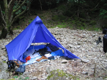 | このテン場広々としていて気持ちがいい^-^ 今晩のおかずは買出しした魚や野菜のアルミホイル焼き♪ 焚き火を囲んでしばしの極楽タイム♪ しかし、それもつかの間、雨が降り出したやん(><) あかん!焚き火が消えたら夕食のホイル焼きが食えない(TOT) あわてて全部焚き火に突っ込む!! しかしあまりに火力が強いのであっというまに食材は炭に・・・ ああ、にがい。。 それでも、焦げてないところはとてもおいしく食べれたので、遠火でゆっくり焼くと極上の定番の夕食になりそうだ!! この雨はいったん止むが日暮れとともにまた降りだして深夜までテントを叩いた。 翌朝は曇り。雨は夜のうちにやんだようだ。 渓の朝はとてもすがすがしい^-^ のんびり朝食を食べる。 テン場を後にし、まずは一見支流に見えるが本谷の7m滝を右横の壁から越える。 滝上はナメになっていてすぐ前方に牛鬼滝60mが落ちている!! これは美しい滝だ^-^ しばし見とれる。 その間にやまとさんはさっさと巻きにかかってるじゃん。 あわてて追いかける!! ここは左岸側から巻いていく。しばらく急なルンゼを上がり適当な高さになったら落ち口方面にトラバース。 落ち口の上でやまとさんに追いついた。床に降りるのが少し悪い。やまとさんはロープを出して慎重に降りる。 僕は少し先に進み、段差が少なくなったところでクライムダウンで降り立った。 滝上からは美しいナメが続く。ナメ床の先には15m斜瀑があり左岸側を巻く。 すぐに50m滝が目の前に!! ここは両岸立っているが立ち木も多くどっちからも登れそうだ。 今回は右岸から巻くことにする。 立ち木を掴みながらエテクライムでどんどん高度を上げる。 滝の落ち口くらいの高度まであがりトラバース。最後の10mほどは滝下までスッパリと落ちていて足元が不安。 念のためロープを出して落ち口まで移動した。 すぐ先に今度は25m滝とその上は大岩壁!! ここでもしばし見とれる。。 すごいぞ〜 立間戸谷!! |