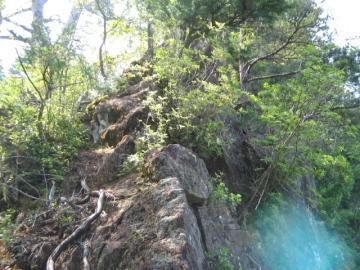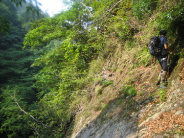 | しかしまだまだ谷は終わらない^-^ すぐに15m斜瀑が登場!! 「これは登れるんとちゃうん??」ってなことで2回チャレンジして2回ともすべり落ちる^-^; やまとさんもチャレンジしたがあともう一息で断念右手の樹林帯に逃げ込む。 で、またすぐに40m滝登場!! ホントになんてところっ!! ここは左岸から巻くが尾根に出たところがナイフリッジになっていて両側がすっぱり切れおちてる。 そのかわり展望も申し分なく今まで歩いてきた谷が遥か下に見えている。 その先には熊野川が! 落ち口を越えたあたりで尾根から離れて谷に戻る。連瀑帯もようやく終わったようで穏やかな渓相に変わった。 しばらく歩いていくと二俣になっていて右手に植林小屋が立っている。 ここは小屋をぐるっと巻くように右俣へ入る。その先ですぐに谷は左に折れしばらく登山道と平行する。 平凡な河原状の谷を進んでいくと立間戸谷名物?の1000mのナメが始まった!! 歩いても歩いてもナメが続く。。 途中支谷が何本か入るがそのつど地形図であたりを付けならがら進む。 ナメが途切れるとガレガレの谷になり両岸は植林。倒木が谷を塞ぐようになったので左手の藪に突入。 急斜面の藪こぎでヒーヒー言いながら登っていくと林道に飛び出た。 ほんで頂上はどこ?? 林道を高い方目指して歩くとあやしげなこんもりとしたピークがあったので登ってみるとそこが子ノ泊山(906m)の頂上だった^-^ 頂上からの景色はいいはずなのだが残念ながらガスで展望なし。。 パンをかじりながらしばし休憩。。 さて、今度は出合まで戻らないといけない!! やまとさんに下山道はどこ?? って聞くとぜんぜん調べてないらしい^-^; 僕も地形図はあるが登山道は載ってない・・・ 帰り道がわからん(T◇T) しばし頂上付近の林道を右往左往しながら半泣きになる。 最後にここがダメなら登ってきた藪漕いで谷に戻ろうって決めて進んだ北向きの林道の終点から立間戸方面への下山道を発見! 赤テープに沿ってどんどん下っていき登りで通った見覚えのある谷に降り立った。 少し谷沿いに歩くと植林小屋のある二俣だ。 しかし、ここで登山道をハズシてしまった。 いったん尾根にあがったところで行き詰る。。 ここはだれ?? わたしはどこ?? お〜い!だれかあ(T◇T) しかたがない、地形図とコンパスがあるしなんとかなるかってことで適当に下っていく。 すると斜面はどんどん傾斜を増していき最後はロープを出して懸垂下降を繰り返す。 それでもなんとか登山道の通る支谷に降り立てた。 そこからすぐにテン場に到着。 あとはクルマの置いてある立間戸谷橋まで一気に下った^-^ 一回迷ったけど・・・ 今回も楽しい沢登りが出来ました♪ やまとさんありがとう〜 |