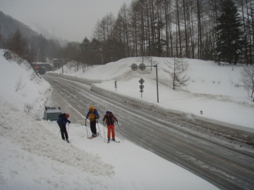 | この週末は悪そうな低気圧がやってくるらしい。 なので予定していた日本海側の山をあきらめて平湯温泉に逃げてきた。 しかし、寒気の影響はこのあたりでも猛威を振るうらしい。午前中ならまだマシっぽいので輝山に登る事にするする。 ラクな南面から登って北東尾根を滑る計画だ。 まずは下山予定地の福地温泉入り口付近にクルマを1台デポ。 もう1台で平湯トンネル西口付近に移動する。さっそく準備をして出発。なるべく早く抜けてしまおう。 まずは冬期閉鎖中の平湯峠への道路を進み、途中から輝山へつづく尾根にとりつく。 急斜面をジグを切りながら登ると切り開きの開けた斜面に出る。 展望はいいのだが雪質はクラストしていてガリガリだ。 どんどん登っていき尾根に到達。あとは尾根に沿って登りきると輝山(2063.4m)のてっぺんに到着。 さすがに天気は悪化している。さっさとランチを食べて滑降にうつる。 南東方面に少し滑り降りると小ピークの登り返しがある、左からトラバースしようとしたが雪が深くて滑らない。 仕方がないのでもう一度シールを貼って尾根に乗りあがる。しばらく進み北東尾根に入るところでシールをはがす。 ここからは快適ツリーランかと思いきや、結構尾根が複雑で飛ばせない。 おまけにこのあたりから吹雪になって視界も悪い。GPSを見ながらとろとろ滑っていく。 最後の最後で林道に降りる手前の斜面だけが唯一楽しく滑り降りることが出来た。 あとは林道を下りラッセルでヨロヨロ降りていくだけ。時折吹くブリザードのような風で全身真っ白になる。 まあ、今日は仕方ないですな。早めに降りたので温泉でまったり過ごす。 同行のみなさんありがとう。 |