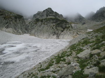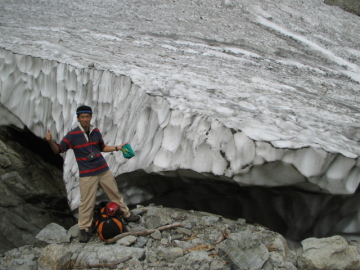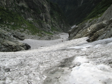 | 今年も夏の間は谷底ばかり歩いていたのでそろそろ稜線歩きがしたくなってきた♪ 常々剱岳周辺の岩場には興味があったのでここらで、かの有名なチンネに行く事に(^-^) しかし所詮源流釣師と中年ピクニッカーのコンビでは難しいところはパスだ(^o^ゞ 数あるルートの中でも左稜線なら行けるかな?ってことで決定した♪ 4:30。待ち合わせ場所の豊科ICすぐのコンビニに着くとすでにかっきーは到着し仮眠していた。 コンビニは改装中で閉まっていたので、かっきーを起こし大町に向かう途中にあるコンビニで買出しをしたあと扇沢へ向う。 さすが3連休。扇沢の駐車場はすでにいっぱいになっている。 なんとか空きスペースを見つけて車を止める。 アルペンルートの玄関口である扇沢は観光客、ハイカー、登山者が入り混じりながらごった返していた。 始発は7:30なので1時間以上並んだあと、やっとトロリーバスに乗る事ができた。 扇沢からはトロリーバス、ケーブルカー、ロープウェイ、トロリーバスと乗り継ぎ室堂へ。 さっそく時間を惜しんで歩き出す。 室堂から剱沢へはよく知った道だ。 ここ何年も来てなかったので景色ひとつひとつがとても懐かしく感じれる。 雷鳥沢キャンプ場から浄土川を木橋で渡り雷鳥坂の登りにかかる。 ここで靴に異変が起こり始めた! いま流行のミッドソールの劣化じゃ〜ん(T◇T) 靴底が剥がれるっていうアレです。。 詳しくはブログに書いたので興味のある方はどうぞ♪ 多少のテンションダウンはあったものの「なんとかなるかあ」ってことで登り続けた。 そんな僕のテンションにお構いなく周りの景観は素晴らしい。 立山から大日岳へ続く稜線、称名川、弥陀ヶ原など手に取るように見えている。 そしていよいよ別山乗越まで登ると剱岳が姿を見せた。 剱岳は高校2年の時に初めて登って以来、20年間僕のNo1の山であり続けている。 剱沢キャンプ場への道を下る際はいつも小走りなのだが、さすがに今回は靴がこの状態じゃねえ。。 ゆっくりと靴に負担をかけないように降りていく、それでも30分ほどでキャンプ場に到着した。 雷鳥沢のキャンプ場もそうだったがここもすでに結構な数のテントが張ってある。 みんな連休前から入ってるのだろうか?? ここでランチタイム(^-^) パンをかじりながら景色を楽しむ。 キャンプ場から剱沢雪渓に下りはじめる。 さすがにこの時期は雪渓もだいぶ後退していてしばらく登山道を行くことに。 武蔵谷出合あたりから雪渓に降り立った。 平蔵谷出合を通り過ぎ、長次郎谷の出合に着いたのは13時前だ。 靴の不調によりスピードが上げれないのがもどかしい。 長次郎谷の出合で先について休憩されていた滋賀県からの二人組とお話しをする。 同じくチンネを登るとのことで、泊まりも同じく熊ノ岩を予定されてるらしい^-^ 混みこみも嫌だけど他にだれもいないのも寂しいので心強い♪ さて、ここからはアイゼンをつけて長次郎谷を登り始める。 斜度もあって一歩一歩くるしい。 しばらく登るとクレバスが口を開けていた。。 通行不能なのでいったん左岸にあがり迂回する。 雪渓に戻って登っていくと今度は雪がきれて滝が出ていた。 今回は右岸側に逃げるがベルクシュルンドが深くて岸に移れる場所を探しながらウロウロ。 安全な場所で飛び移る。 アイゼンを外し右岸を登っていく。 途中で左岸に渡るとザレ場の登りになる。 遠くに目的の熊ノ岩が見えてるがなかなか近づいてこない。 このあたりになると靴のダメージも大きくなり歩きにくいったらありゃしない。 長次郎谷は熊ノ岩を境にして右俣と左俣に分かれる。ザレ場に付けられた登山道をいくと自然に右俣に入る。 右手に八ツ峰の5.6のコルを見て熊ノ岩の右手を巻くように登ると熊ノ岩BPが見えてきた。 BPに行くには雪渓を横断しないといけないので再びアイゼンをつける。 結構傾斜があるのでスリップすると下のクレバスにのまれてしまうだろう。。 慎重に渡り熊ノ岩の上にある平坦地に荷物を下ろす。 今日一日なんとか靴はもってくれたが明日はどうなるだろうか・・・ 不安はあるが睡眠不足も手伝って日暮れとともに眠りに着いた。。 |