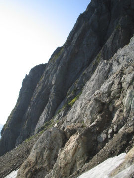 | 翌朝は4時に起床。靴の不調の事もあり暗いうちに出発することに。 ザレ場の登りを避けて雪渓をギリギリまで登り、池ノ谷乗越を目指す。 登ってるうちにだんだん明るくなり立山三山、その左奥には槍ヶ岳も見えている。 池ノ谷乗越に着くと一気に反対側の景色が開けた。 極悪の池ノ谷ガリーの向こうに小窓王が聳えている。 いよいよ北方稜線まで上がった。 久しぶりの景色に感動する♪ 池ノ谷ガリーは足を置くたびに崩れていくガレガレザレザレの下りだ。 相当な靴のダメ−ジを覚悟して一気に降りていく。 3分の2程下ったところで右手の踏み後をたどると三ノ窓に到着した。 誰もいないかなと思いきや縦走の二人組が出発準備をしているところだった。 さて、三ノ窓から南を望むとチンネが聳えている。 取り付きはチンネの基部は基部だろうがどこだろう?? 持って来たのは左稜線のトポだけ。。 とにかく行ってみるか・・・ ザレザレの斜面を下り、アイゼンをつけて雪渓を横断する。 チンネの基部に着いて取り付を探すが・・・ が〜ん!! まったくわからない・・・^-^; これでもない、あれでもない・・ ウロウロウロウロ・・・・ かっきーと二人で考え込む。 刻々と時間だけが過ぎていく。 そうこうしてるうちに滋賀県の二人組がやって来られた。 「ラッキー」取り付きを教えてもらおう♪ しかし、二人組も取り付き探してウロウロしてるじゃないですか!! がーん!! 夢破れたり・・(T◇T) 三ノ窓に着いてから2時間以上経過している。。あせる。。どうしよう。 滋賀県の二人組はあきらめて他のルートを登ることにしたようだ。 聞いてみると中央チムニーを登るとのこと。。 中央チムニー?? それは難しいのか? 簡単なのか?? チンネ全体のトポを持って来なかったのを後悔する。 もう、ここで時間を費やしてても埒が開かないので適当に取り付くことにした。 <おそらくルートから外れたところの1P目>よっC 凹角状のフェースから登り始めるがさすがルート外だけあってピンがない。 一箇所キャメロットでプロテクションを取り、3級くらいのフェースを登っていく。 傾斜は緩くなり広いフェースになったところで支点を発見。ピッチを切る。 <ルート外2P目>かっきー 傾斜の緩いフェースを40m伸ばす。このピッチにはハーケンが打ってあった。 <ルート外3P目>よっC 大きな岩の下を右にトラバースし回り込む。 するとなんと、正面に溝が伸びていて先ほどの滋賀県のパーティが登っているじゃないですか! どうやら中央チムニーの取り付きに着いたようだ。。 ここまで来たらこれを登らないとしゃあないか・・・ <中央チムニー1P目>かっきー チムニーの中に入って登っていく。途中で苦労してるようだ。 しばらくして合図があり登り始める。なるほど結構厳しいところがある。 帰宅後のトポを見るとV級のピッチだがもう少しグレードが高いような気がした。 通常はチムニーに入らず右のカンテを登るらしい。。 <中央チムニー2P目>よっC 再びチムニーの中を行くが左手から壁がかぶってきて登りづらいったらありゃしない。 ここで右手のフェースに逃げて登ることに。 中央バンド手前でピッチを切る。 <中央チムニー3P目>コンテ 傾斜が緩まり、すぐに中央バンドに着く。 中央バンドはとても広くて休憩するにはもってこいだ。 ランチタイムにしてパンをかじる。 僕達はまったく地形が判らず不安だらけだった。 |