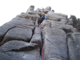 | P7取付より見上げる | P7ノーマルルートD-を登るトミー |