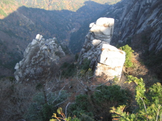 | P3のAスラブはコンテで登り、Bスラブでボクがリード。チムニーWを登る。 Cスラブは再びコンテに変更。のこるはP2ヤグラのみ。 P2ヤグラ W はかっきーリード。 まさに櫓のように立っているが実際はすこし傾斜がある。真ん中に走るチムニーがルートらしい。 3人ともヤグラを登りきったところですでに13時。時間もいっぱいいっぱいになってきたので下ることにした。 せっかくなのでP2か続く山道をたどってP1まで登ってみる。 すぐ先に裏道登山道の尾根が見えているがぐるっと回るのがめんどくさいので北谷側に下ることにした。 本来はヤグラのコルから前壁ルンゼを下るらしいが、下調べをしてない僕たちはP1から直接ガレガレのルンゼを下る。 一歩踏み出すたびに崩れそうなガレを慎重に下りやっとのことで北谷沿いの裏道登山道に出た。 あとはよく整備された登山道をドライブウェイまで一気に下るだけ。 初めての藤内壁。それも入門コースの前尾根だけで堪能できた^^; 大阪からもそれほど遠いわけでもないので何度も通ってみたいと思います。 次ぎ来た時はもっとスマートに登りたいものだ。 |